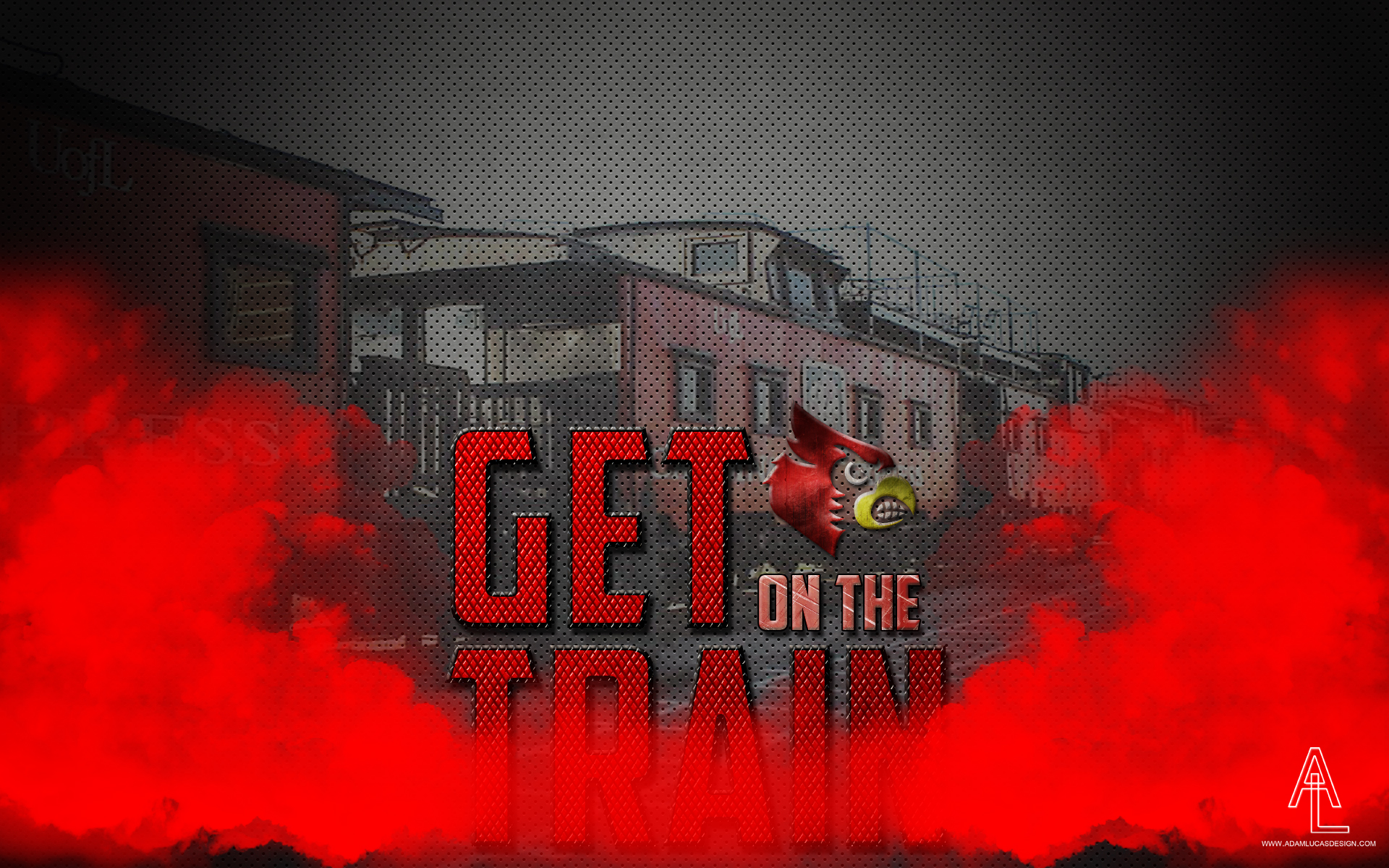 Description: A red smoke cloud with the words get on the train on it and a red fire extinguisher.