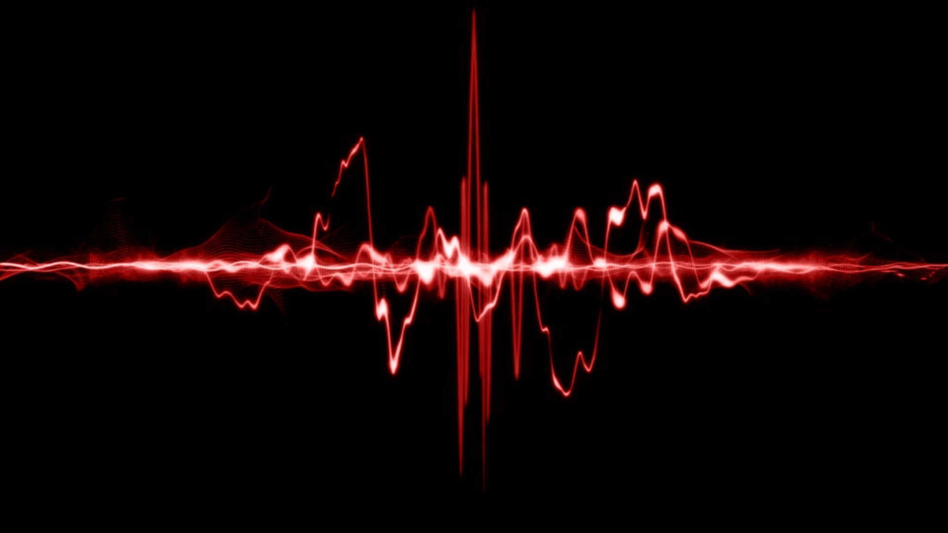 Description: A red sound wave on a black background with a red light in the middle of it and a red light in the middle of the image.