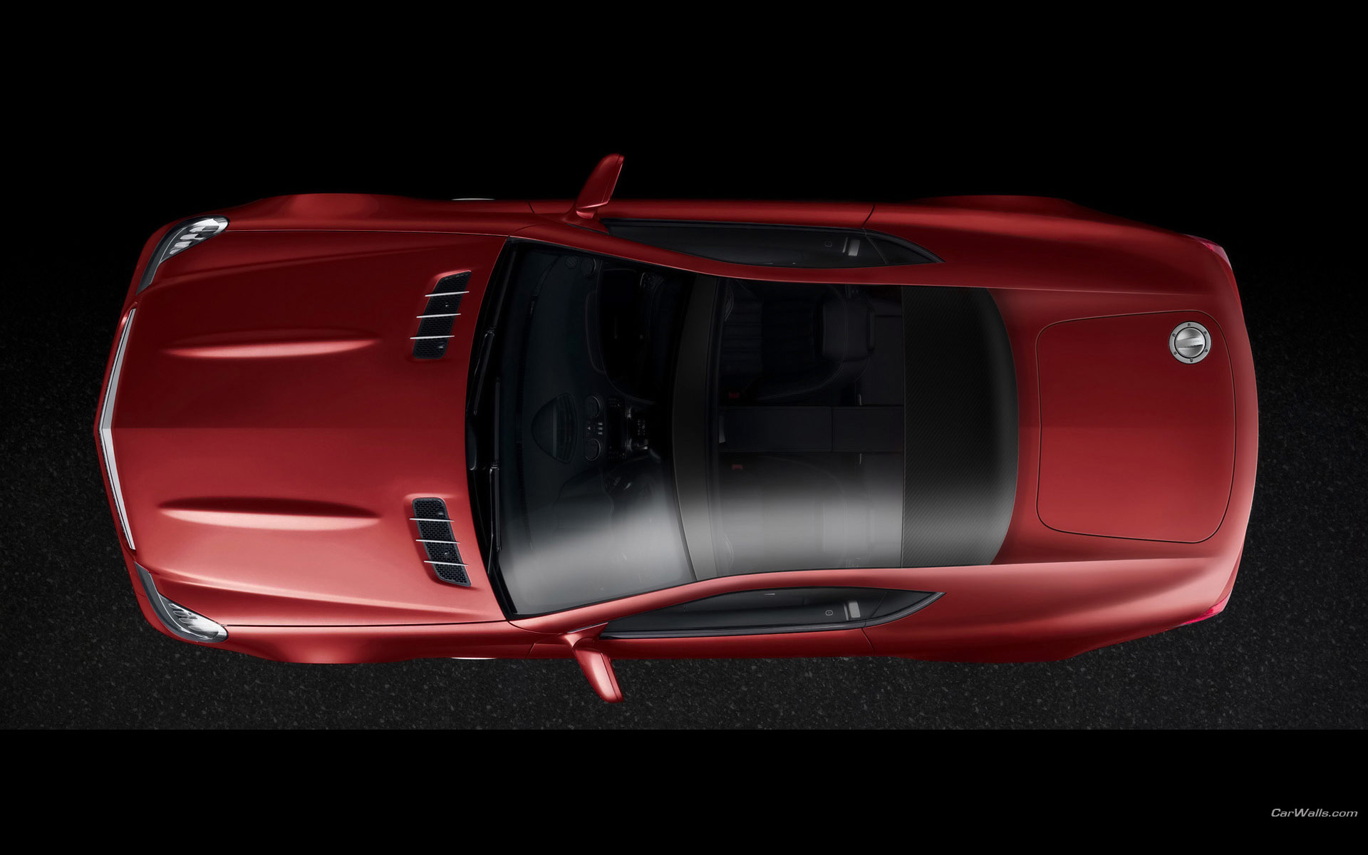 Description: A red sports car is shown from above in a dark room with a black floor and a black background.