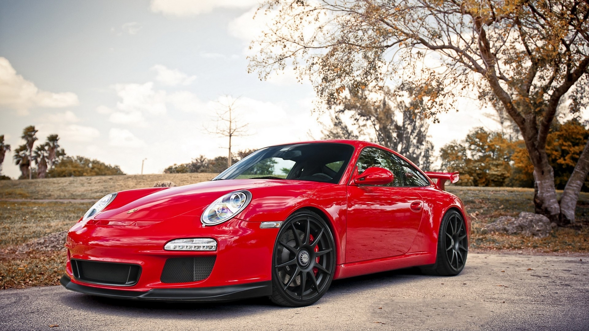Description: A red sports car parked on a road next to a tree and grass covered field with clouds in the sky.