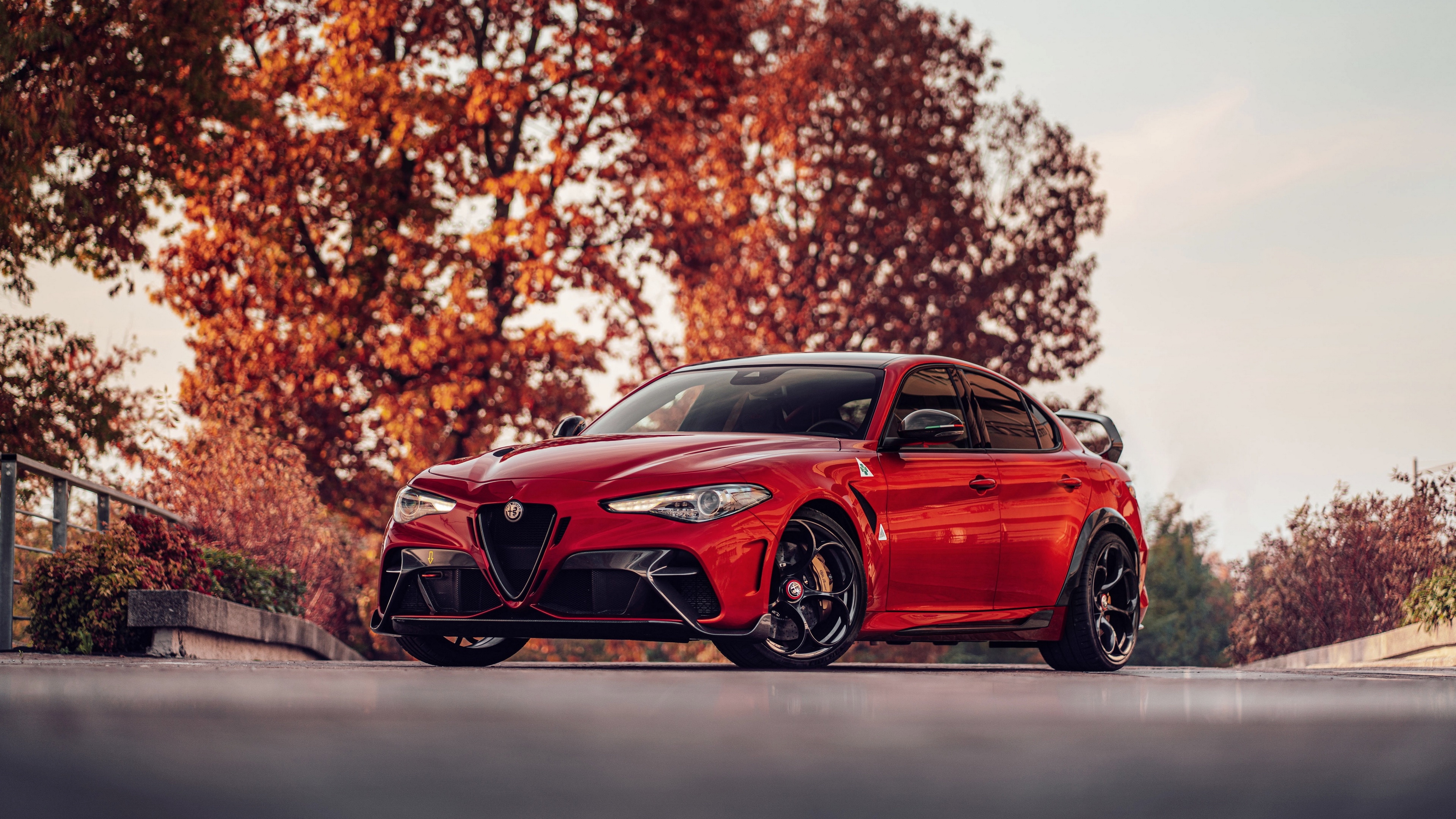 Description: A red sports car parked on a street next to a tree with orange leaves on it and a fence.