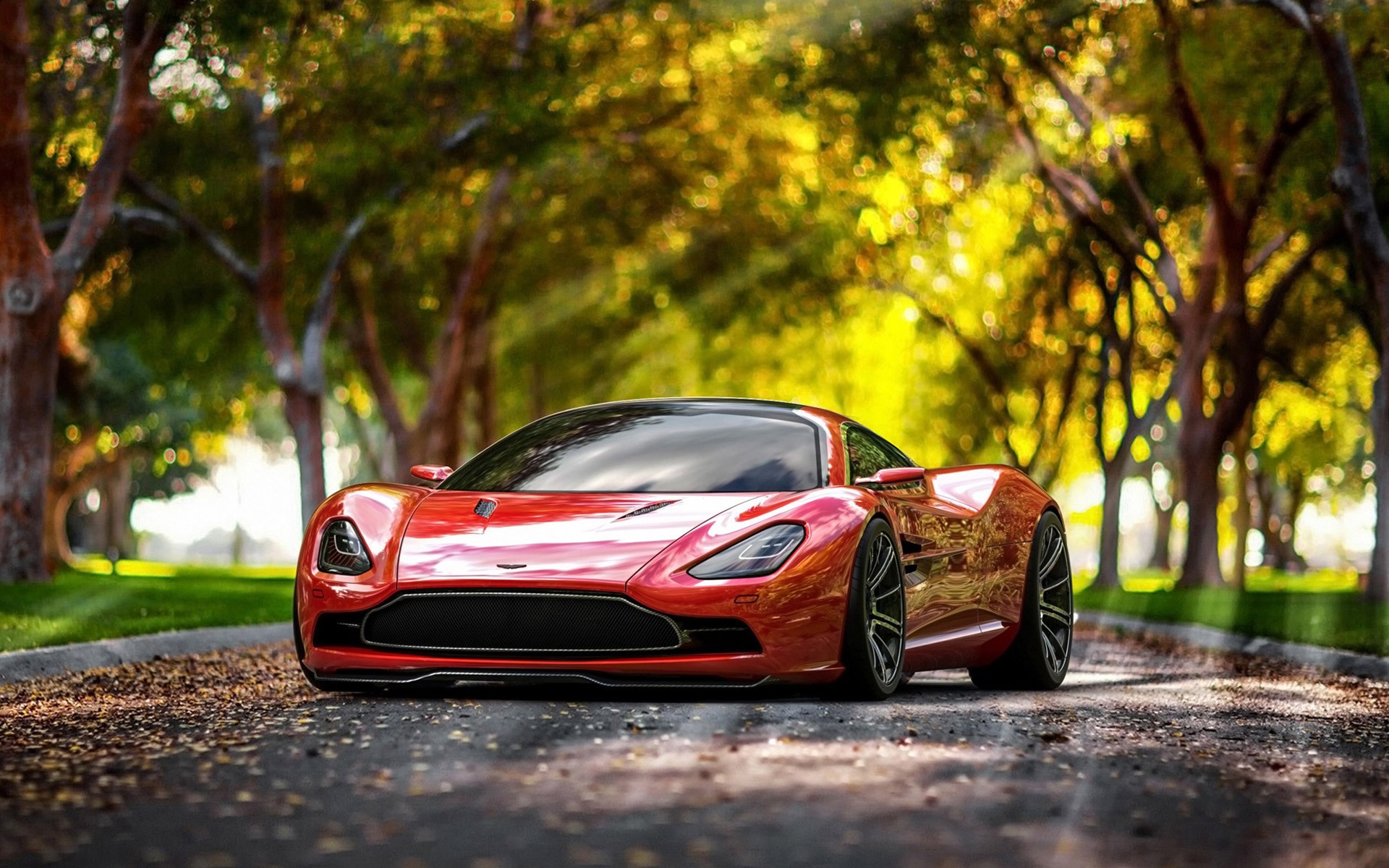 Description: A red sports car parked on a road in front of trees and grass with a green lawn behind it.
