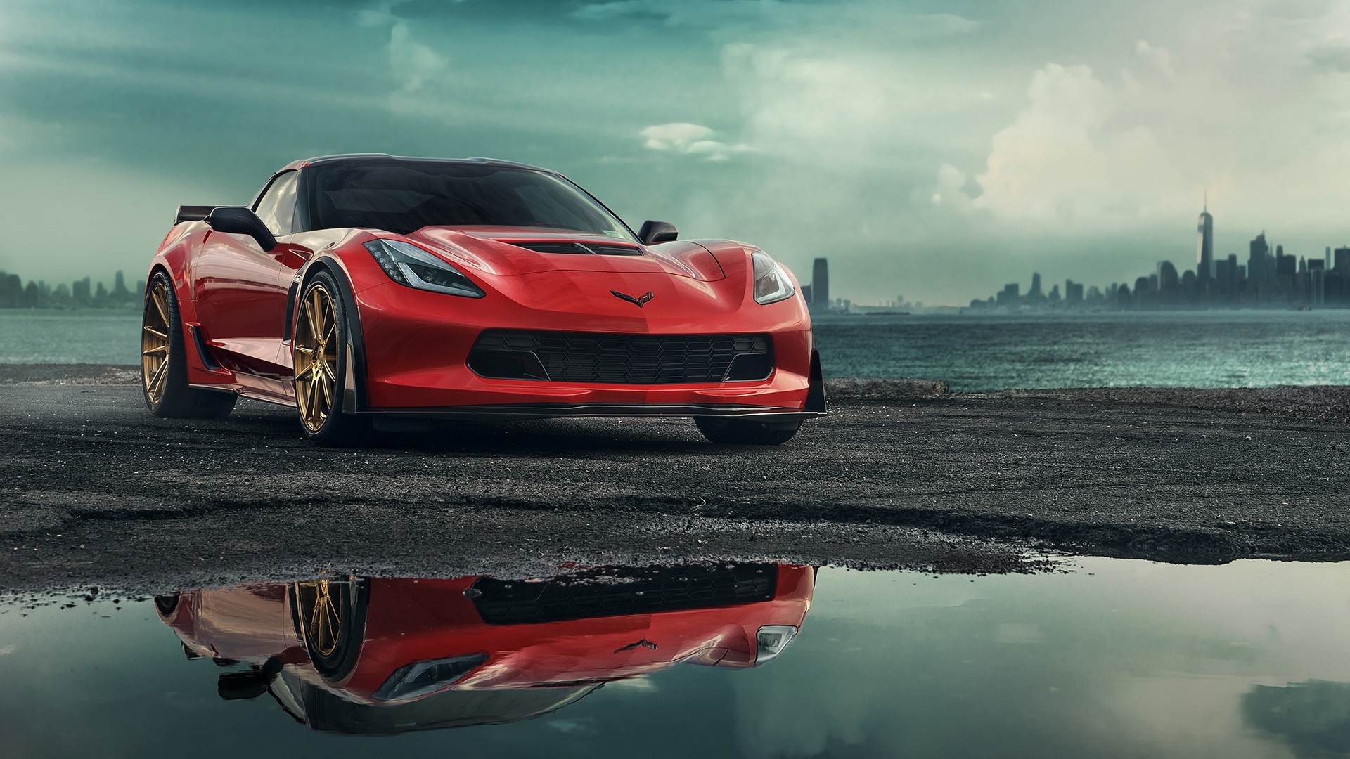 Description: A red sports car parked on a beach next to a body of water with a city in the background.