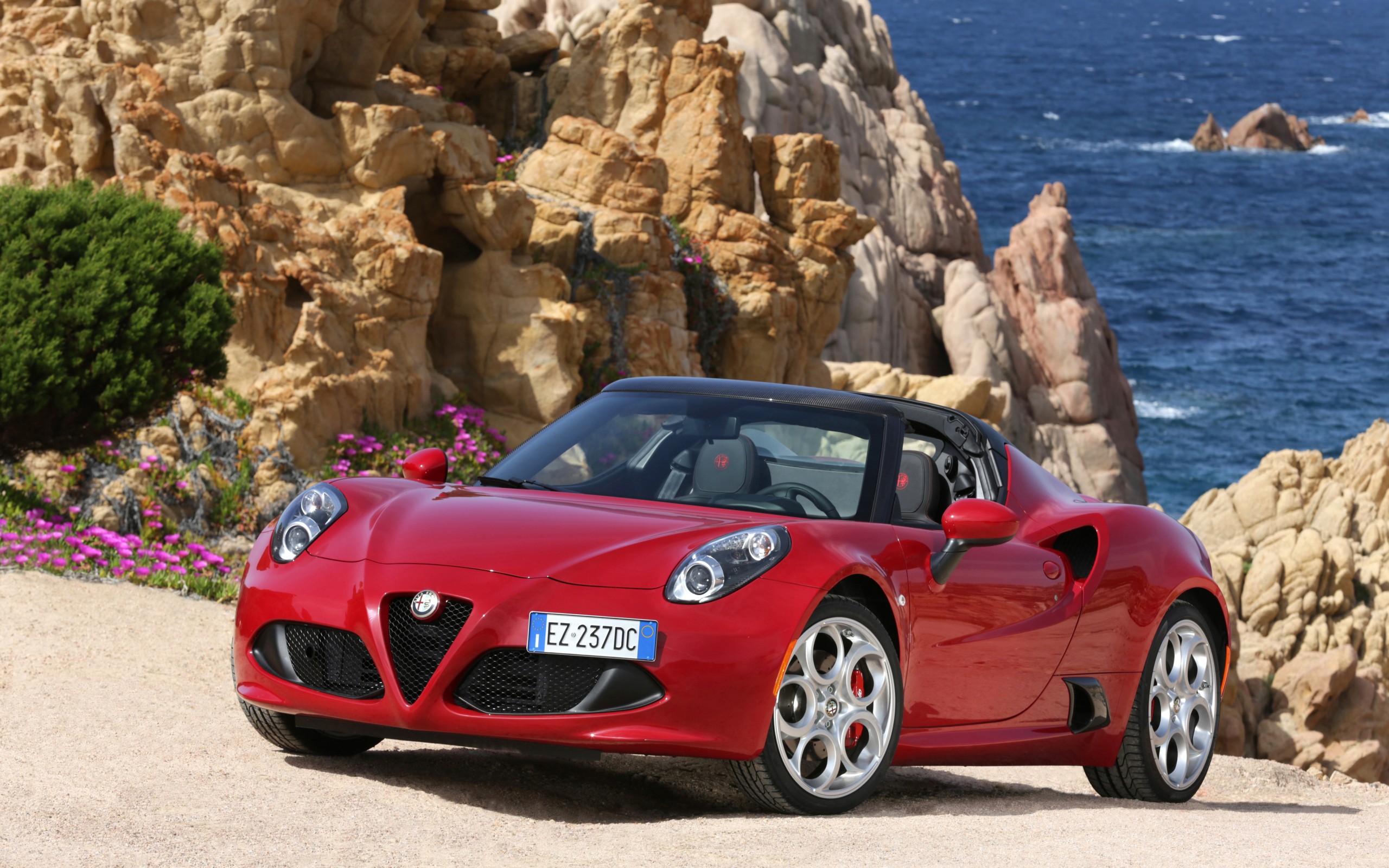 Description: A red sports car parked on a beach near the ocean and rocks with flowers in the front of it.