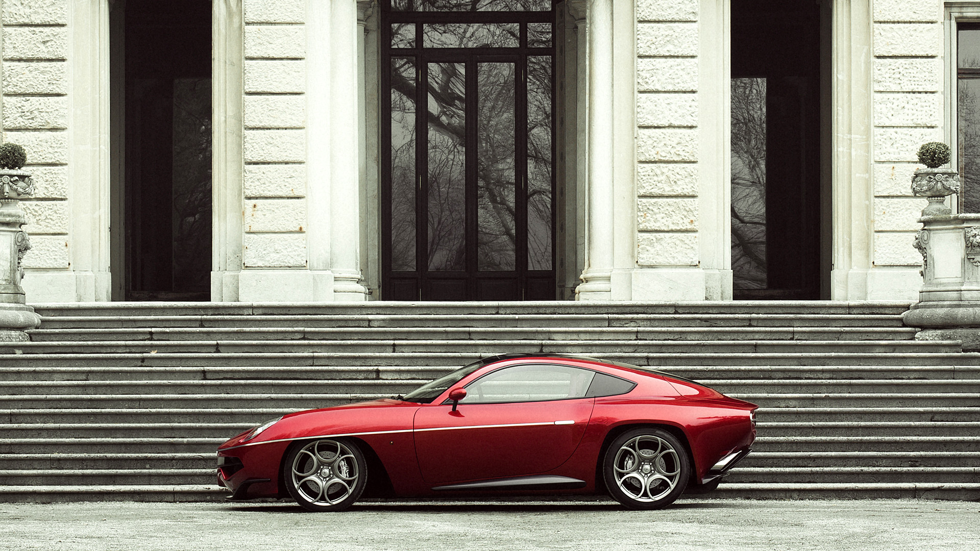 Description: A red sports car parked in front of a building with steps leading up to it and a door on the side of the building.