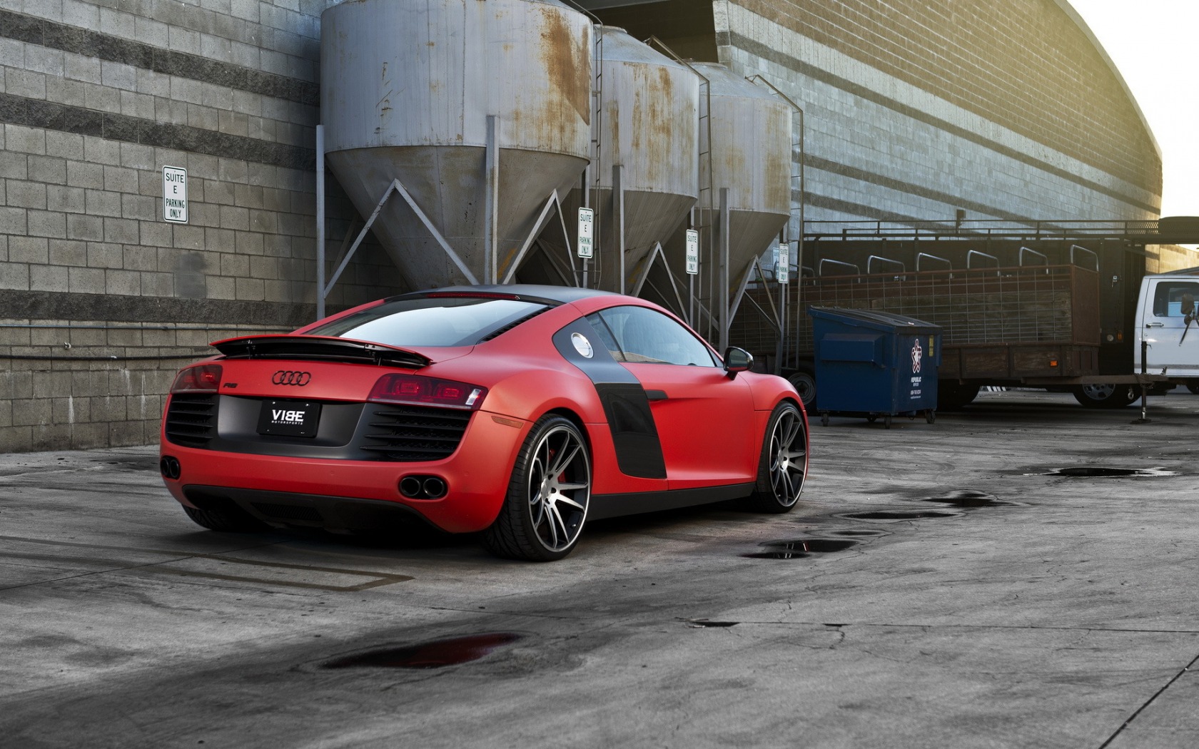 Description: A red sports car parked in front of a building with a truck behind it and a truck behind it.