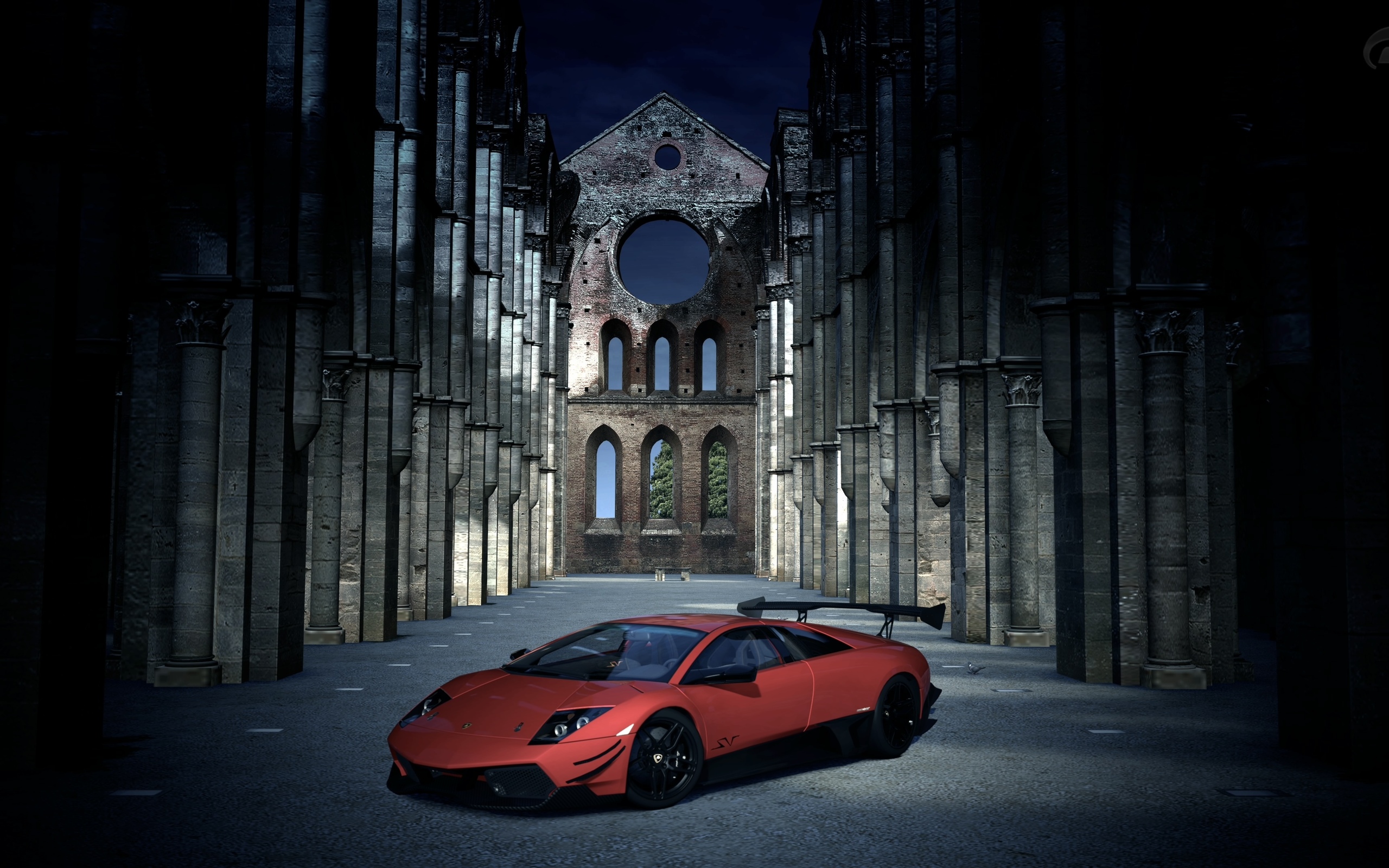 Description: A red sports car parked in a dark cathedral area at night with a dark sky background and a gothic - style window.