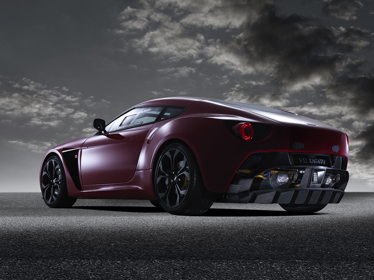Description: A red sports car parked on a dark street under a cloudy sky with clouds in the background and a black and white photo.