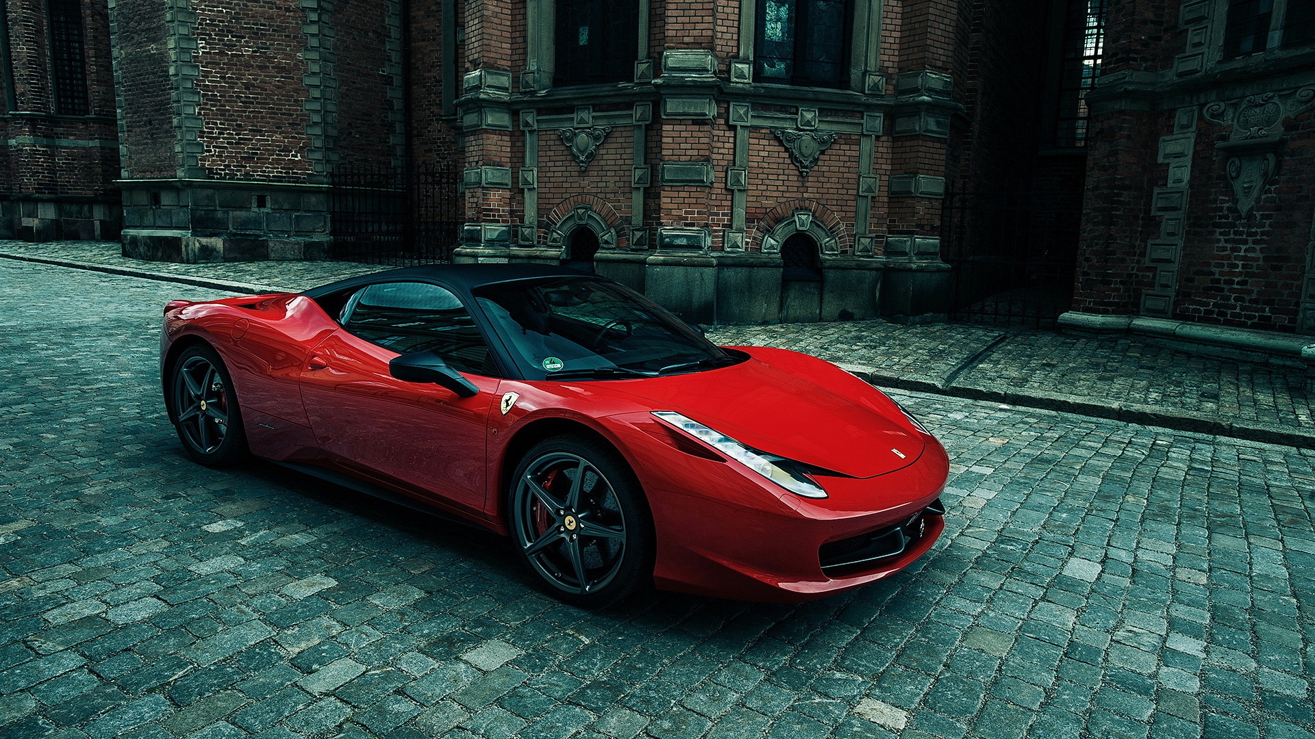 Description: A red sports car parked on a cobblestone street in front of a building with a clock tower.