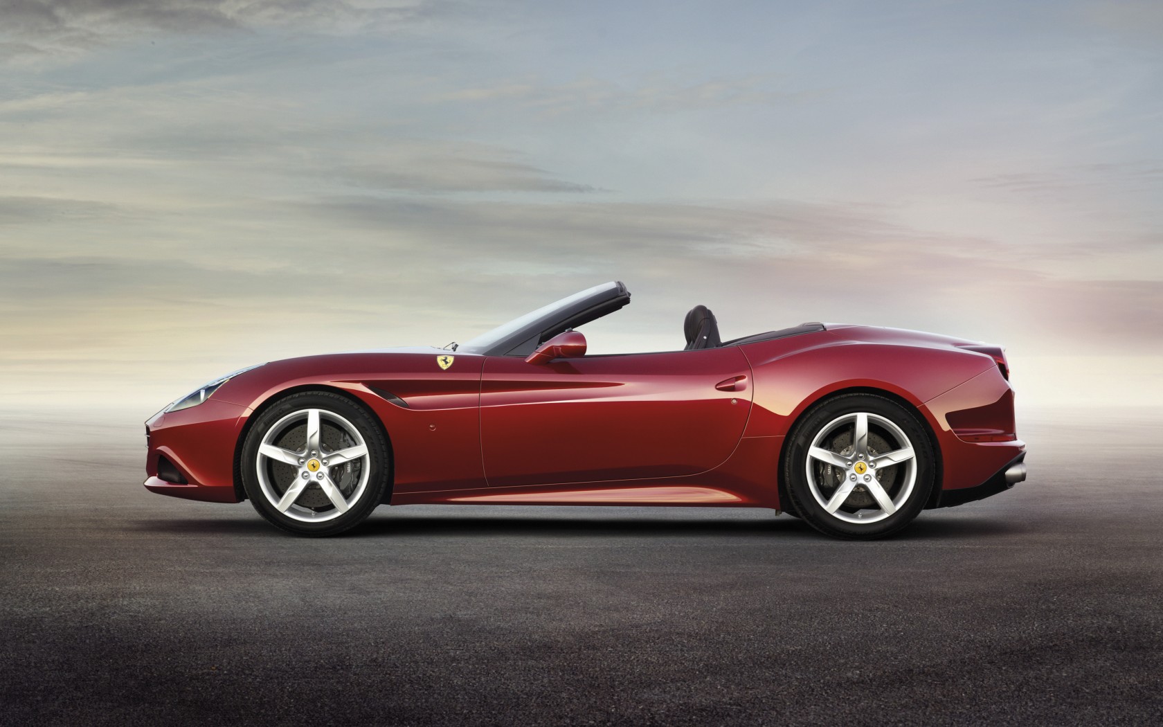 Description: A red sports car parked on a concrete surface with a sky background and clouds in the background.