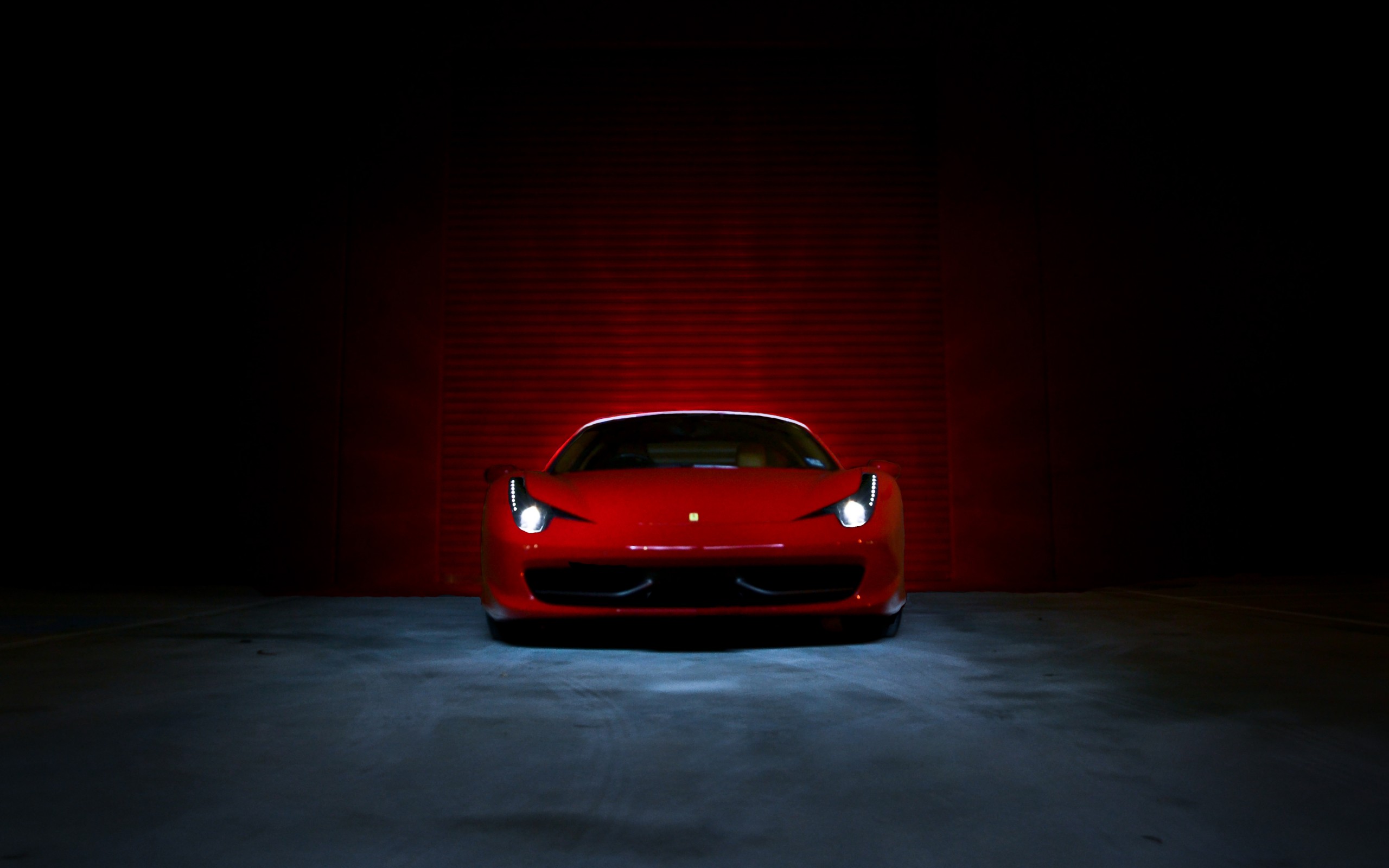 Description: A red sports car in a dark room with a red light on it's headlight and a black background.