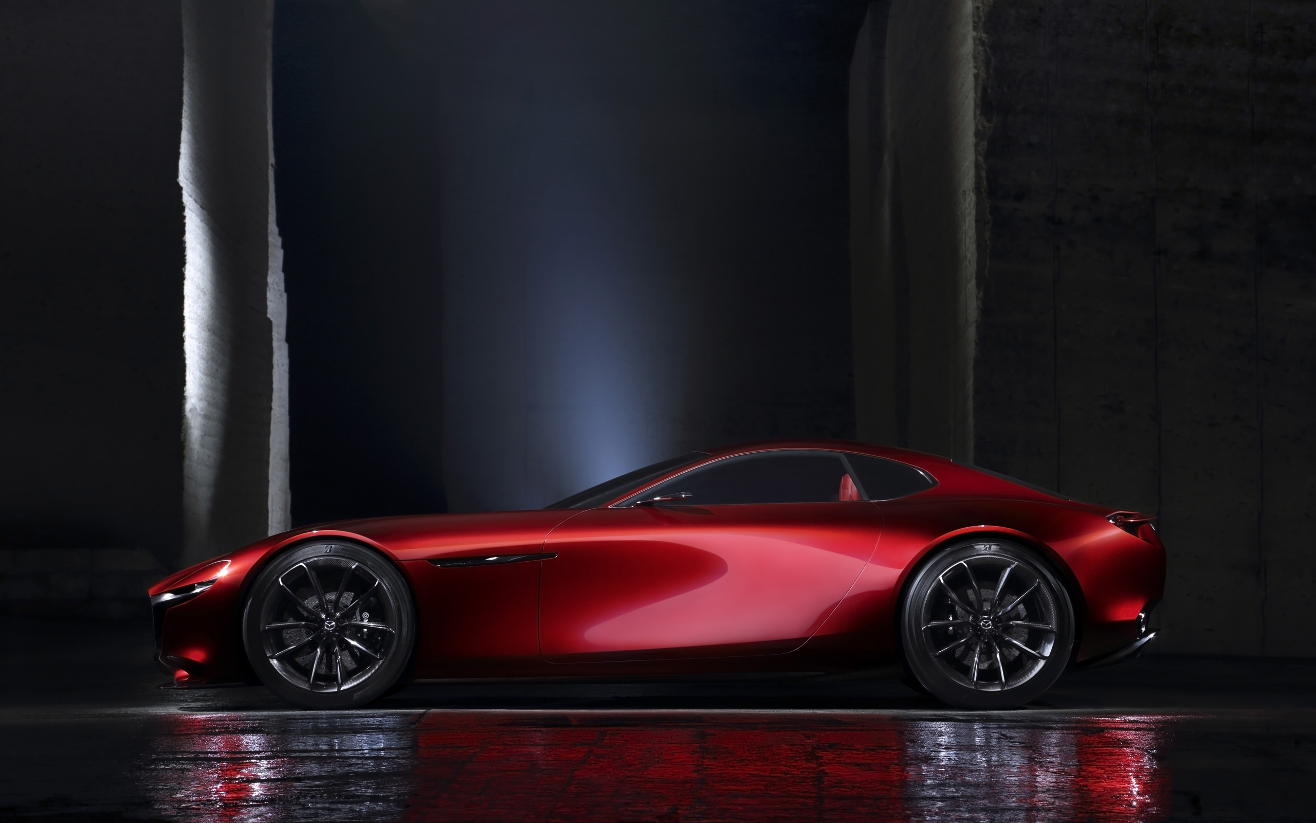 Description: A red sports car parked in a dark room with a spotlight on the floor and a black background behind it.