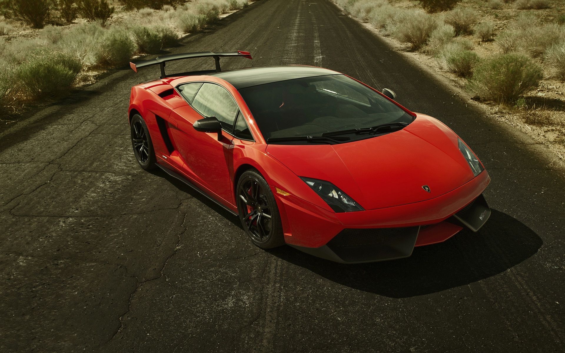 Description: A red sports car driving down a road in the desert with a sky background and grass and bushes in the foreground.