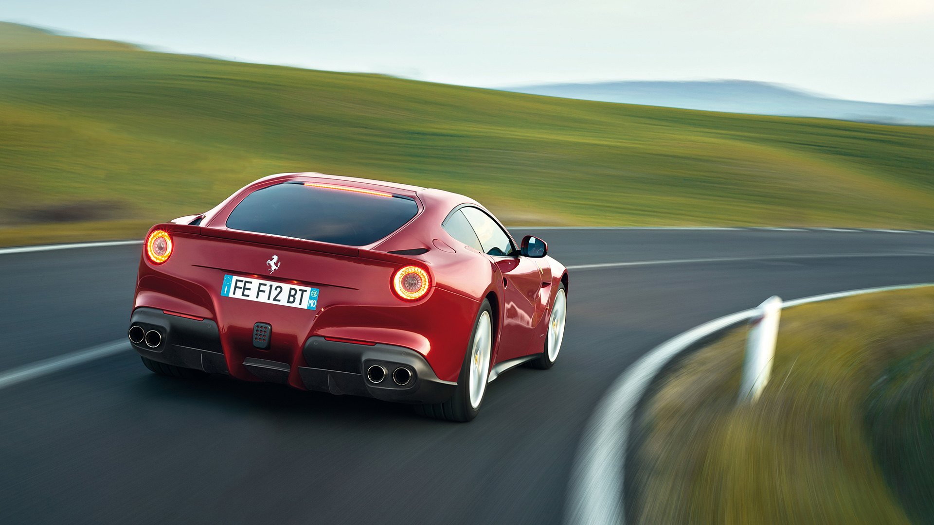 Description: A red sports car driving down a road with hills in the background and a hill in the distance behind it.