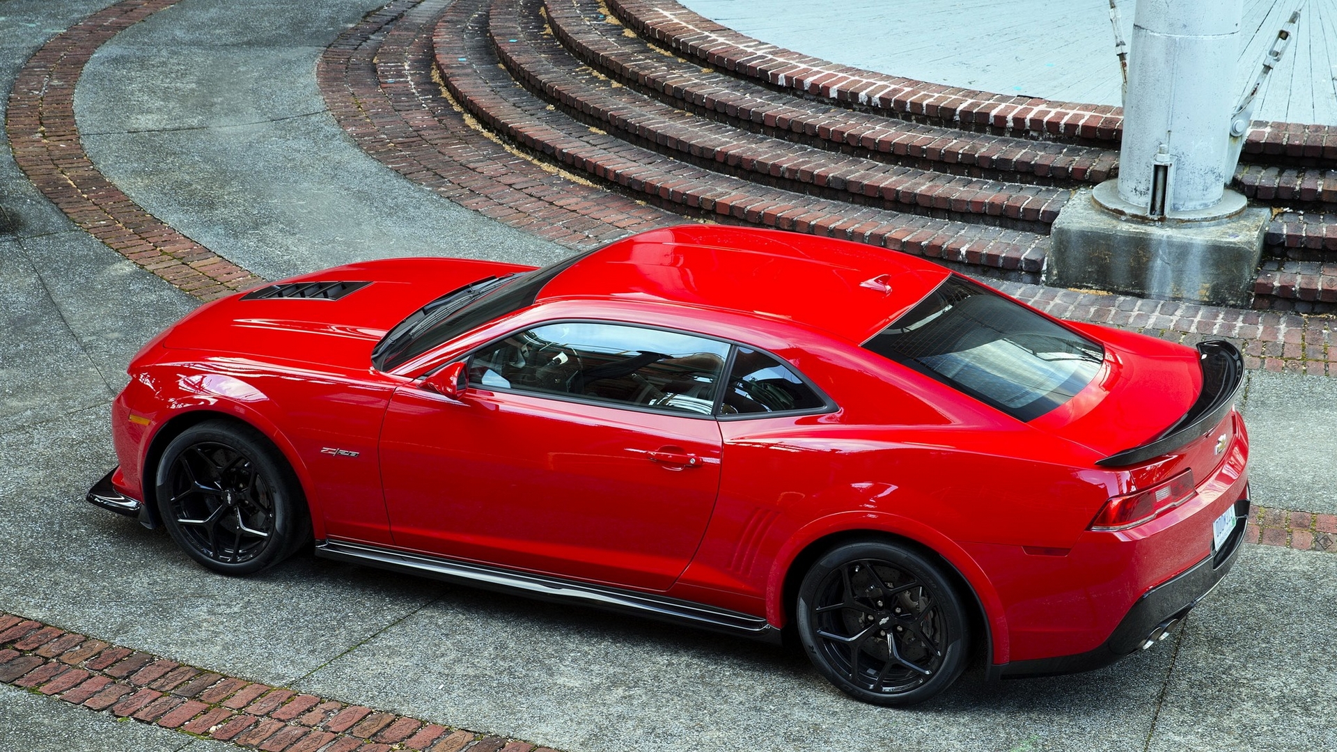 Description: A red sports car parked on a street next to a fountain and steps with a circular design on the side.