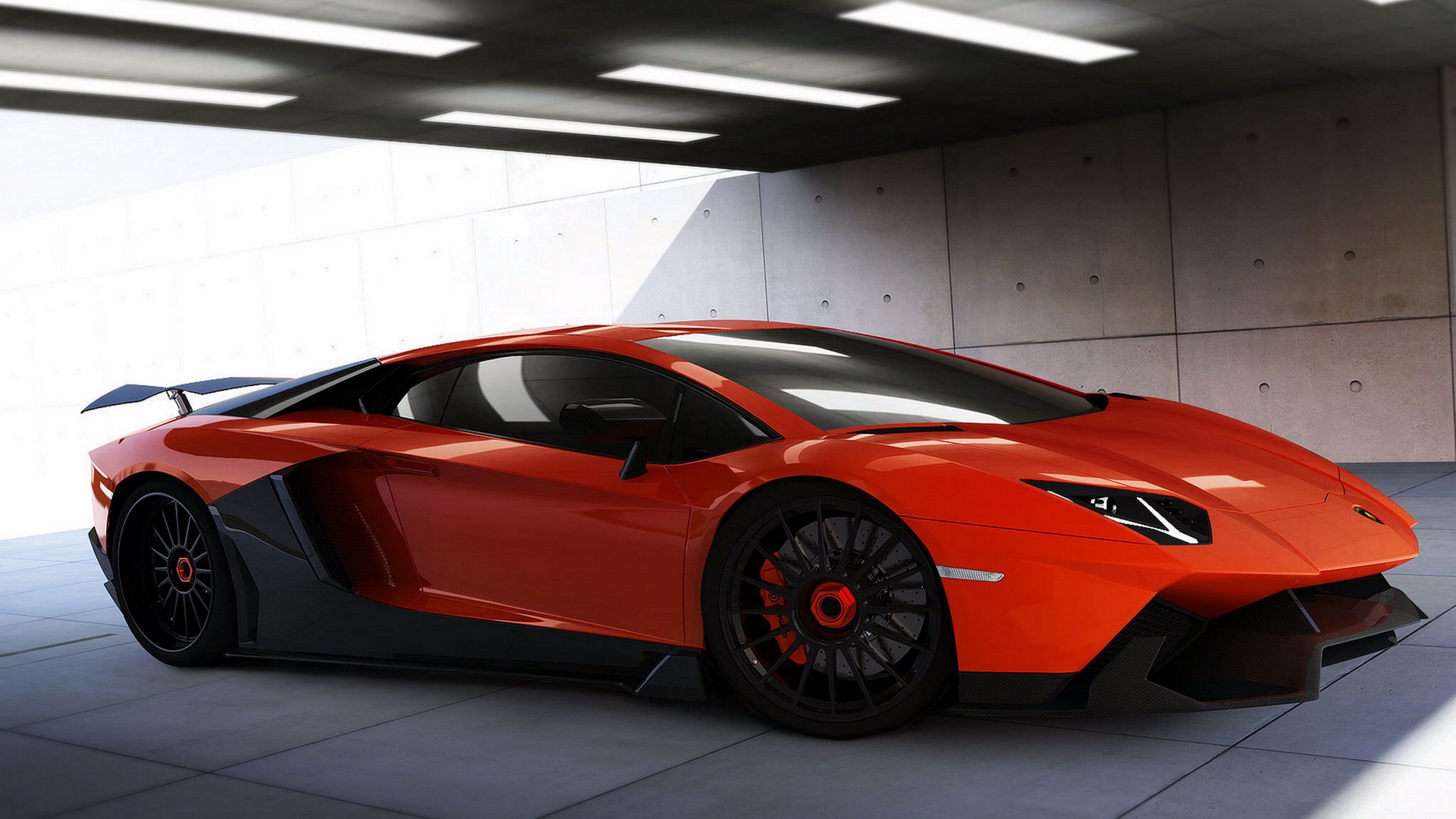 Description: A red sports car parked in a garage with a light on it's side and a black roof.