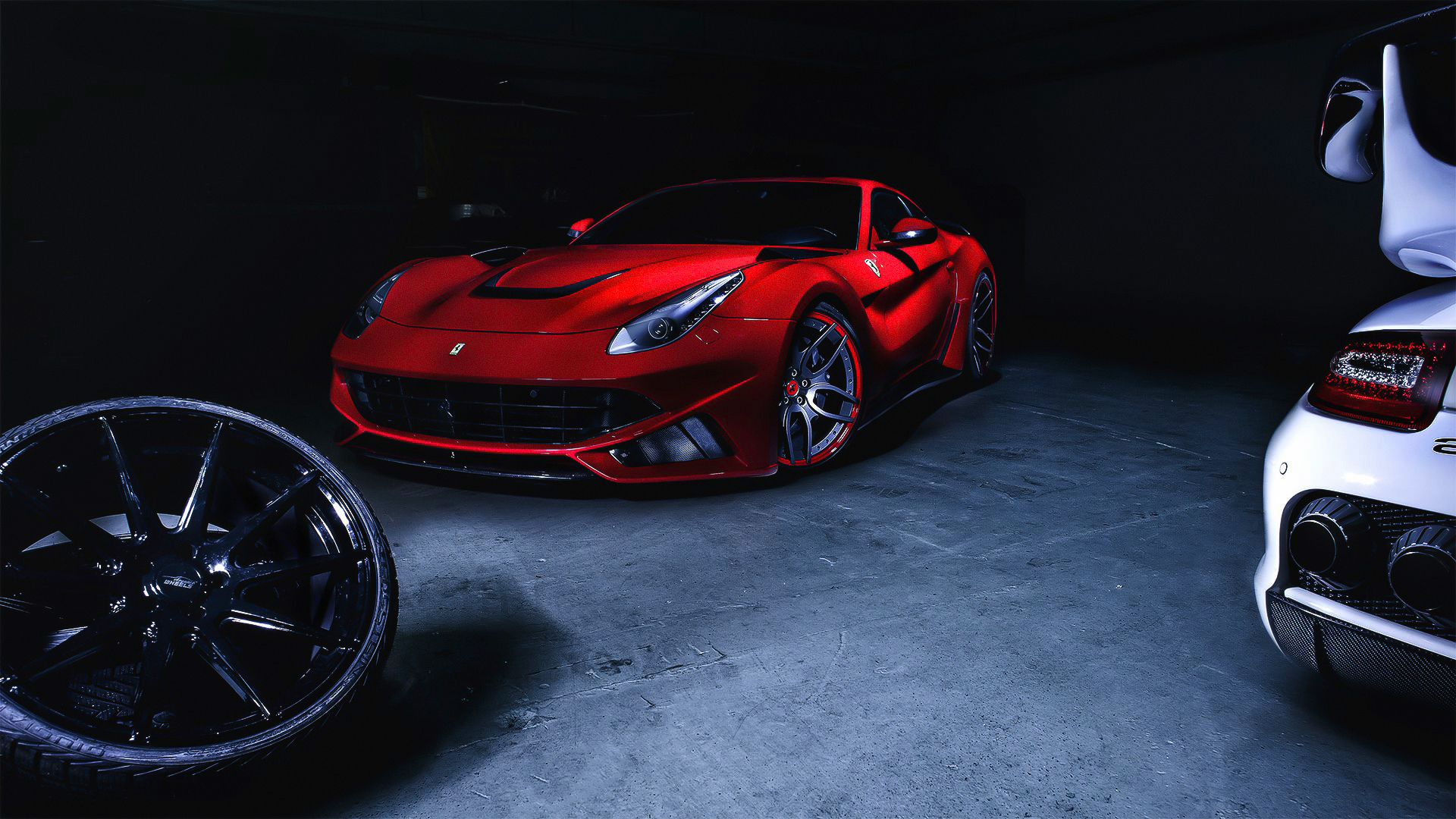 Description: A red sports car parked in a garage next to a white sports car with black wheels and rims.