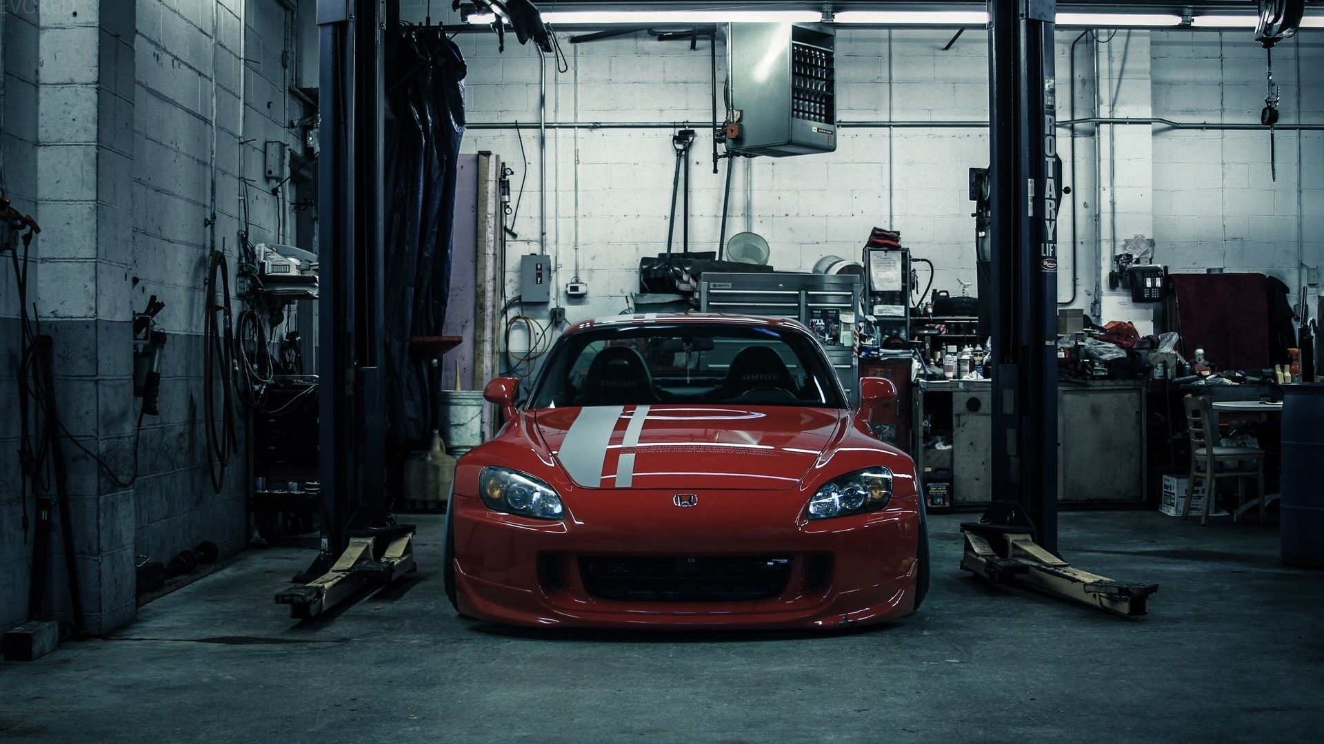 Description: A red sports car parked in a garage with a white stripe on the hood and hood of it's car.