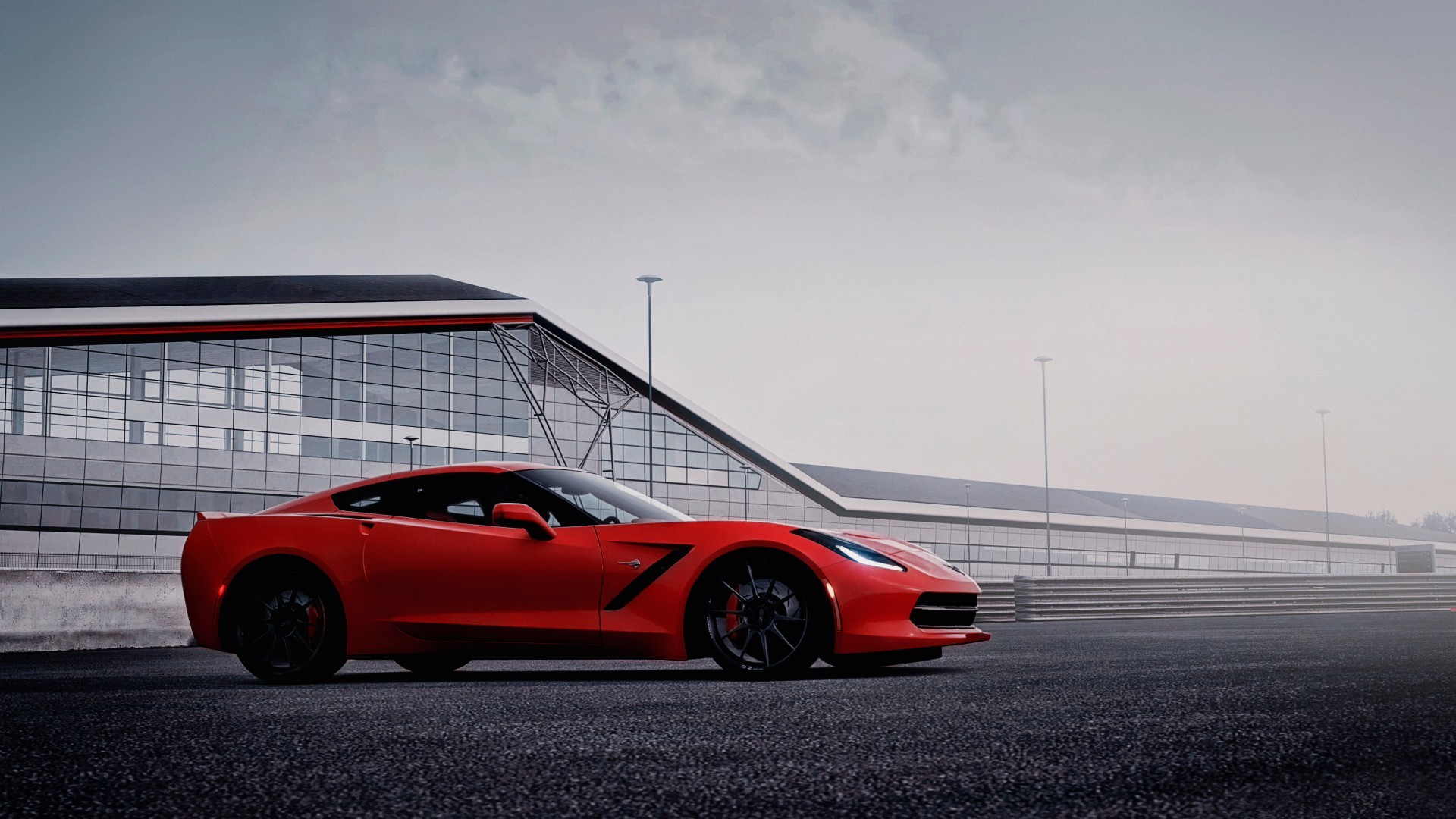 Description: A red sports car parked in front of a building with a glass wall behind it and a red roof.