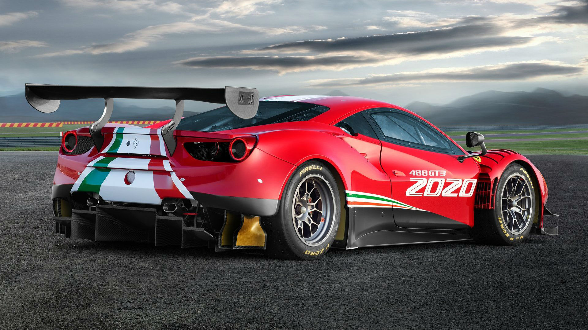 Description: A red sports car with a green and white stripe on the side of it's body and a red and white stripe on the side of the car.