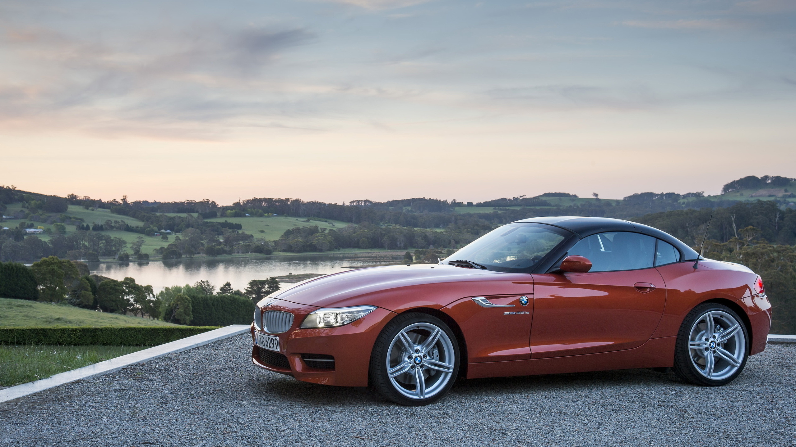 Description: A red sports car parked on a gravel road near a lake and a hill in the distance with a sunset in the background.