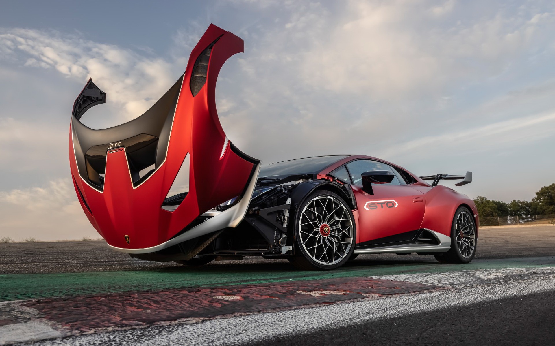 Description: A red sports car with a large wing on the side of it's body is shown in front of a cloudy sky.