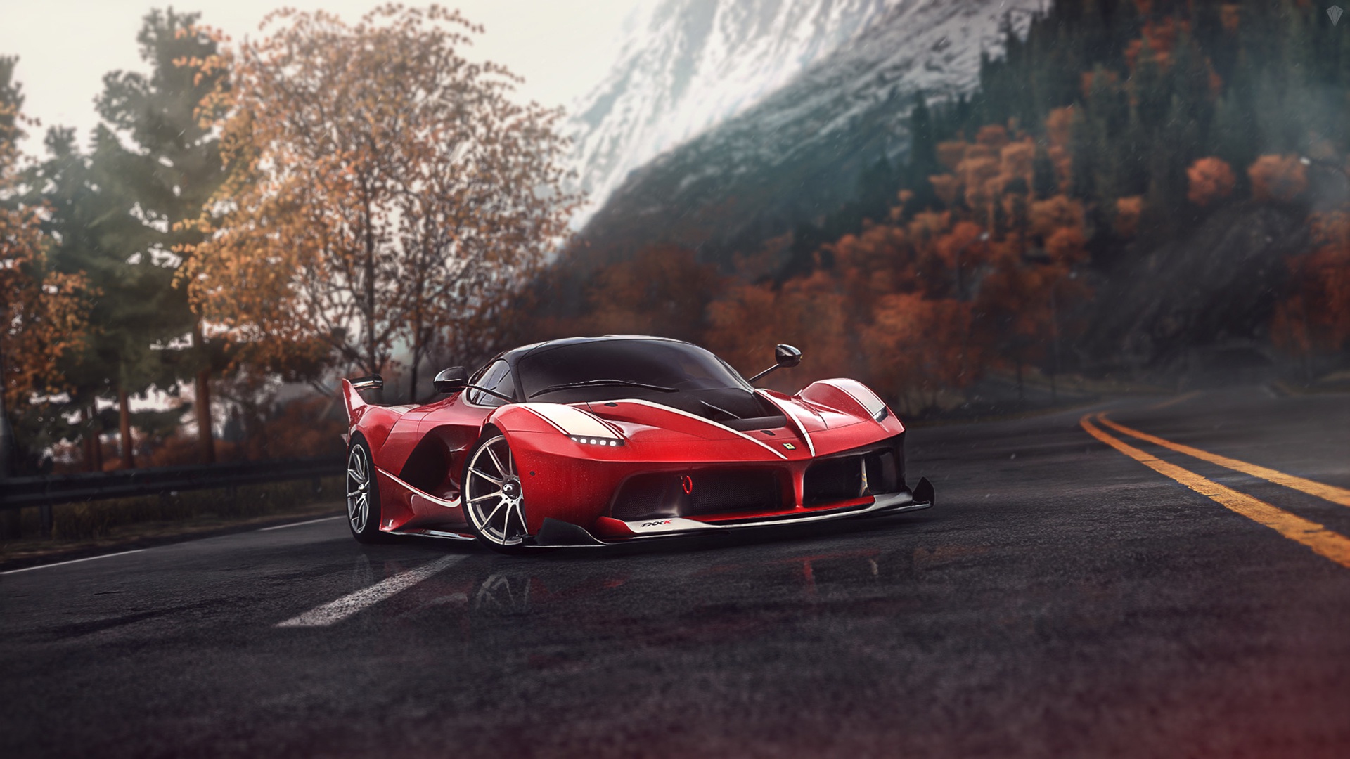 Description: A red sports car driving down a road in the mountains with trees in the background and a mountain range in the distance.
