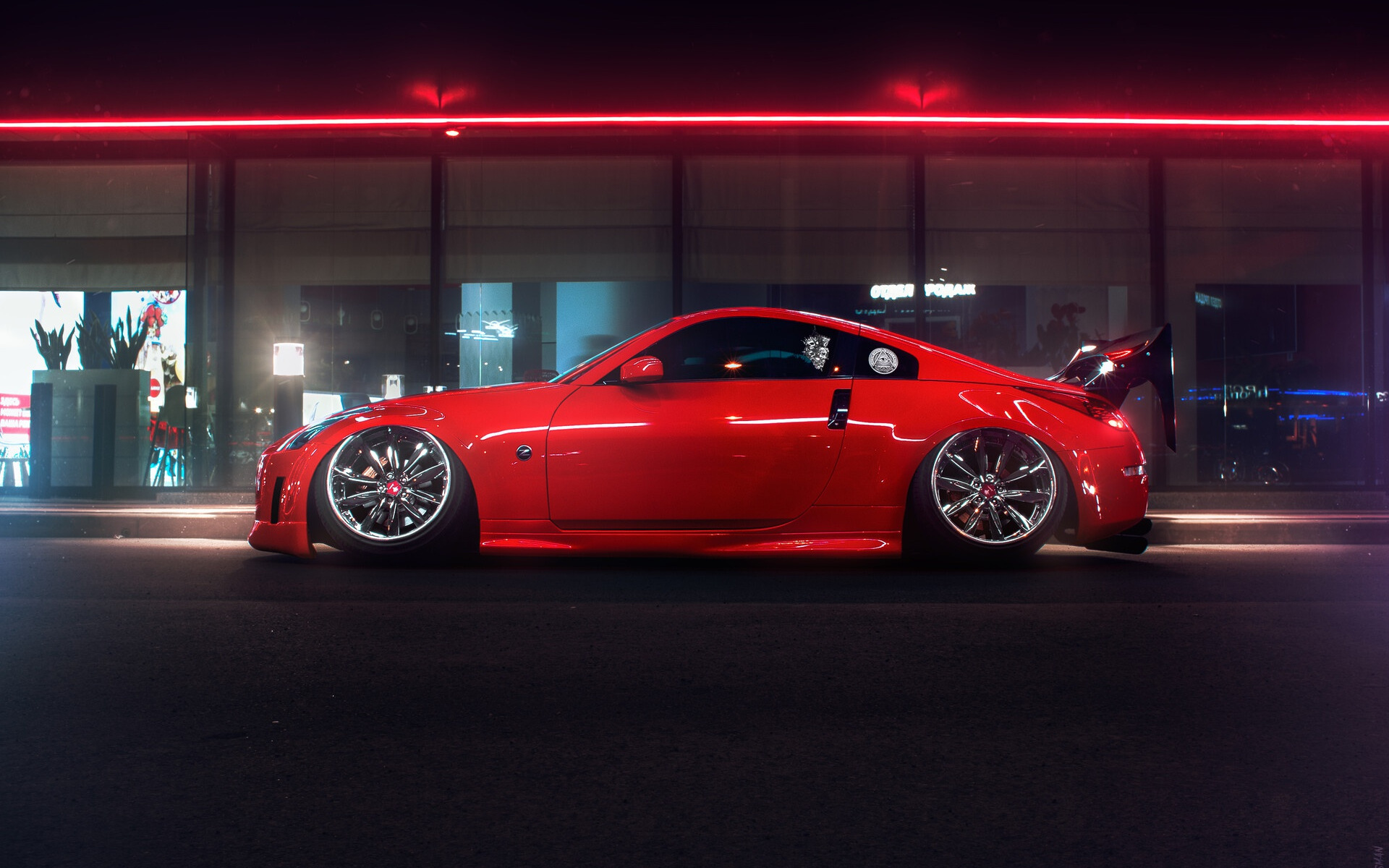 Description: A red sports car parked in front of a building at night with its lights on and a person standing next to it.