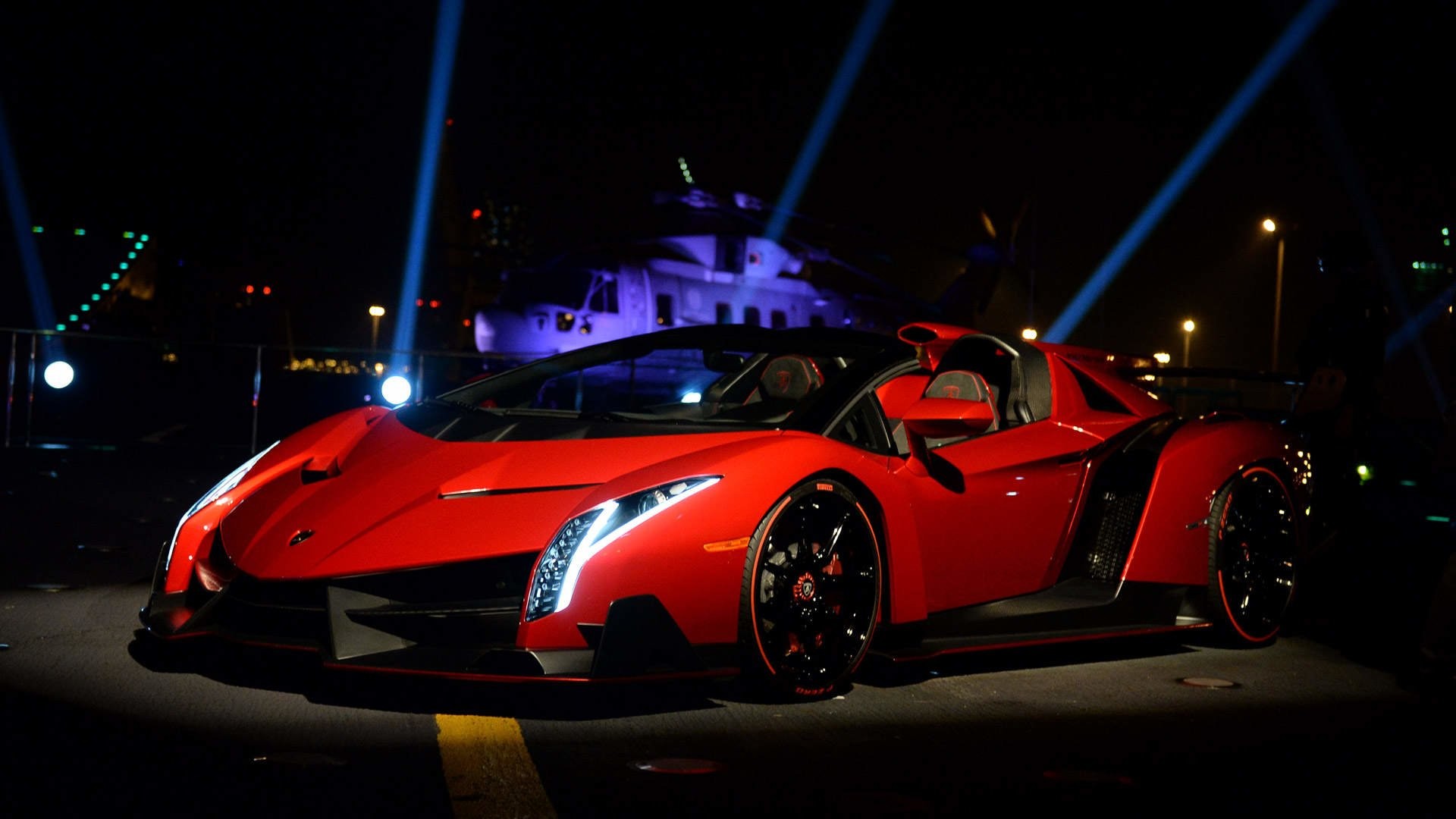 Description: A red sports car parked in a parking lot at night with lights on the side of it and a castle in the background.