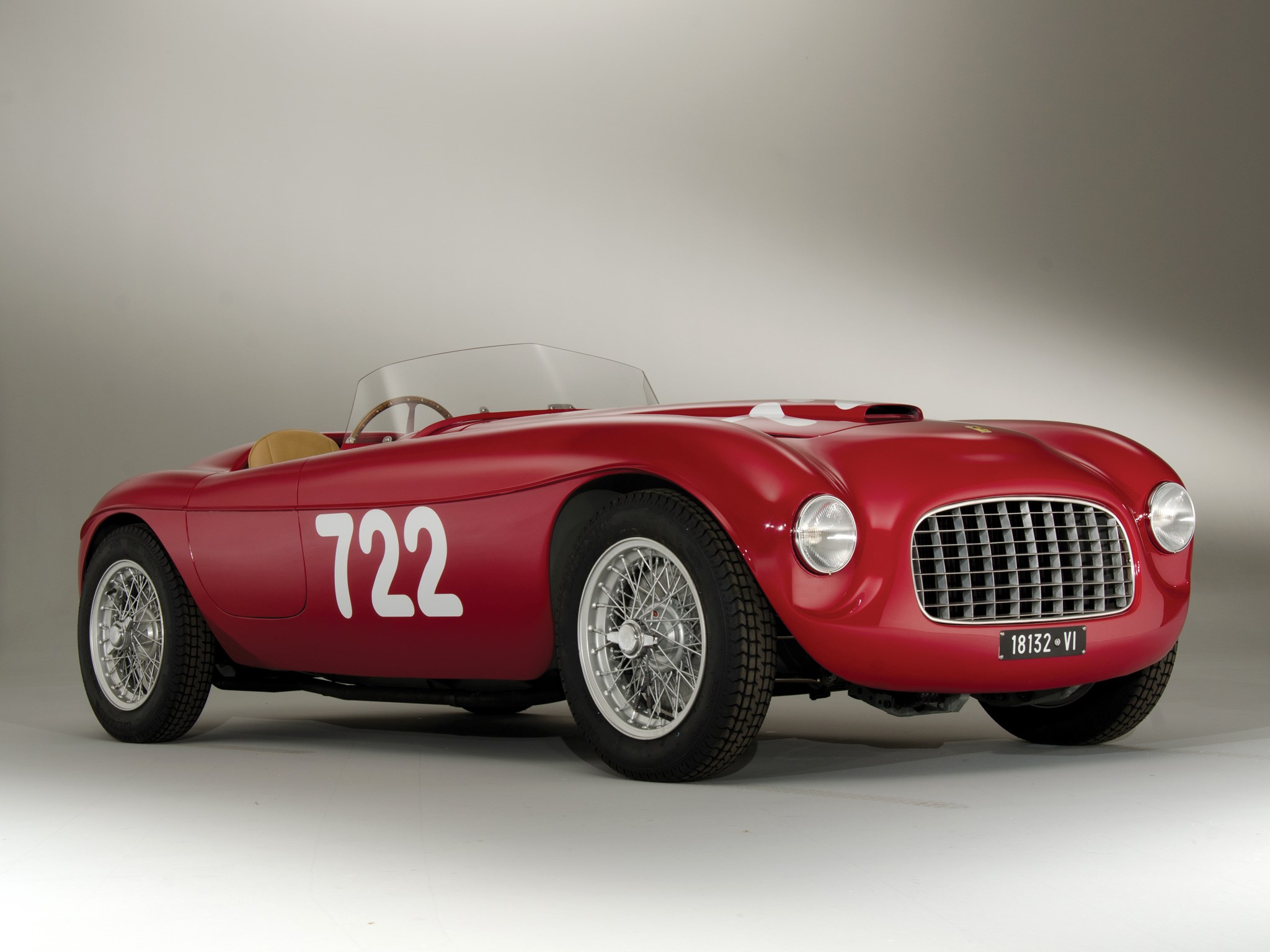Description: A red sports car with a number on the front of it's hood and a white top on the front.