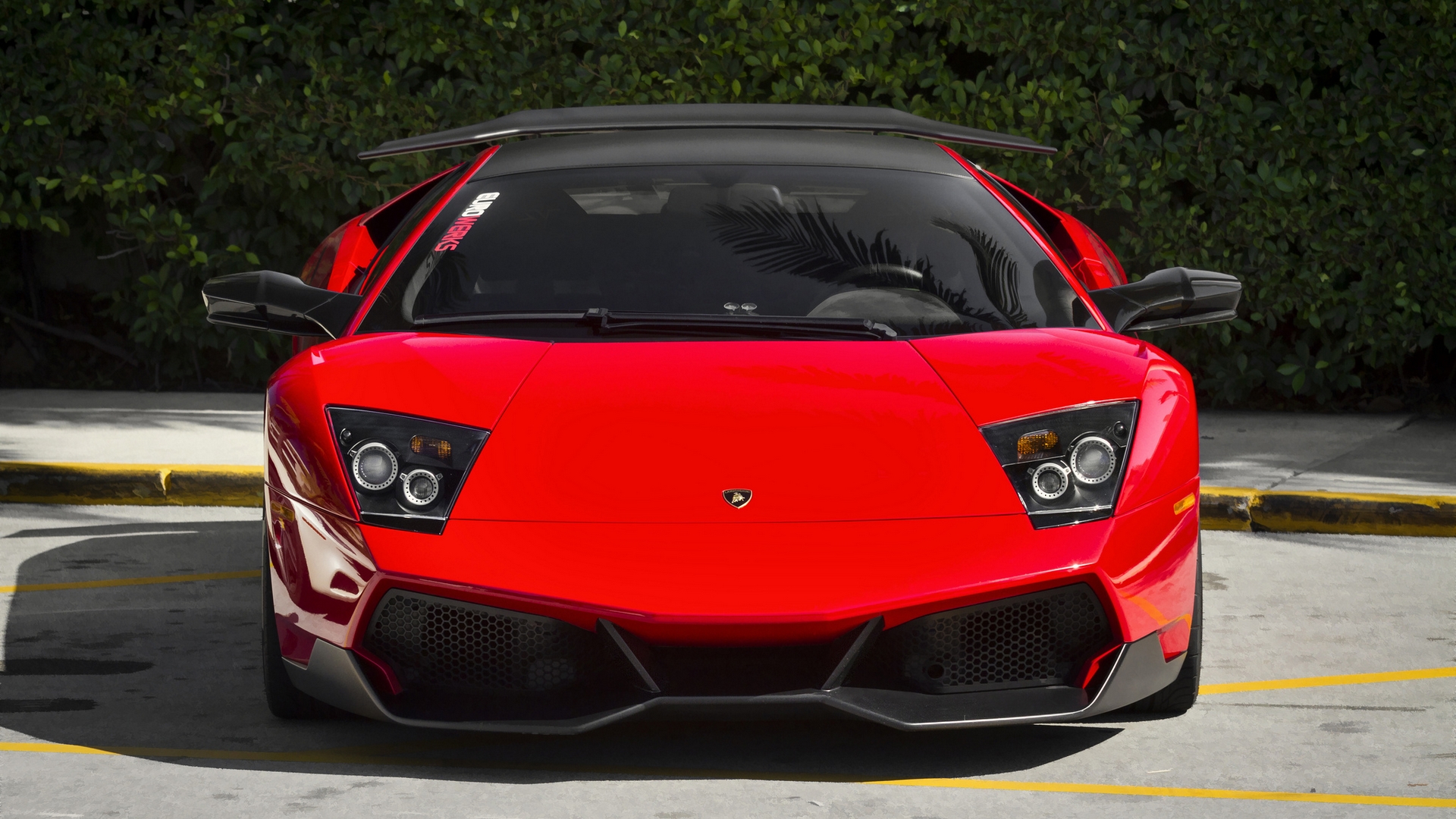 Description: A red sports car parked in a parking lot next to a bush and yellow line on the ground in front of it.