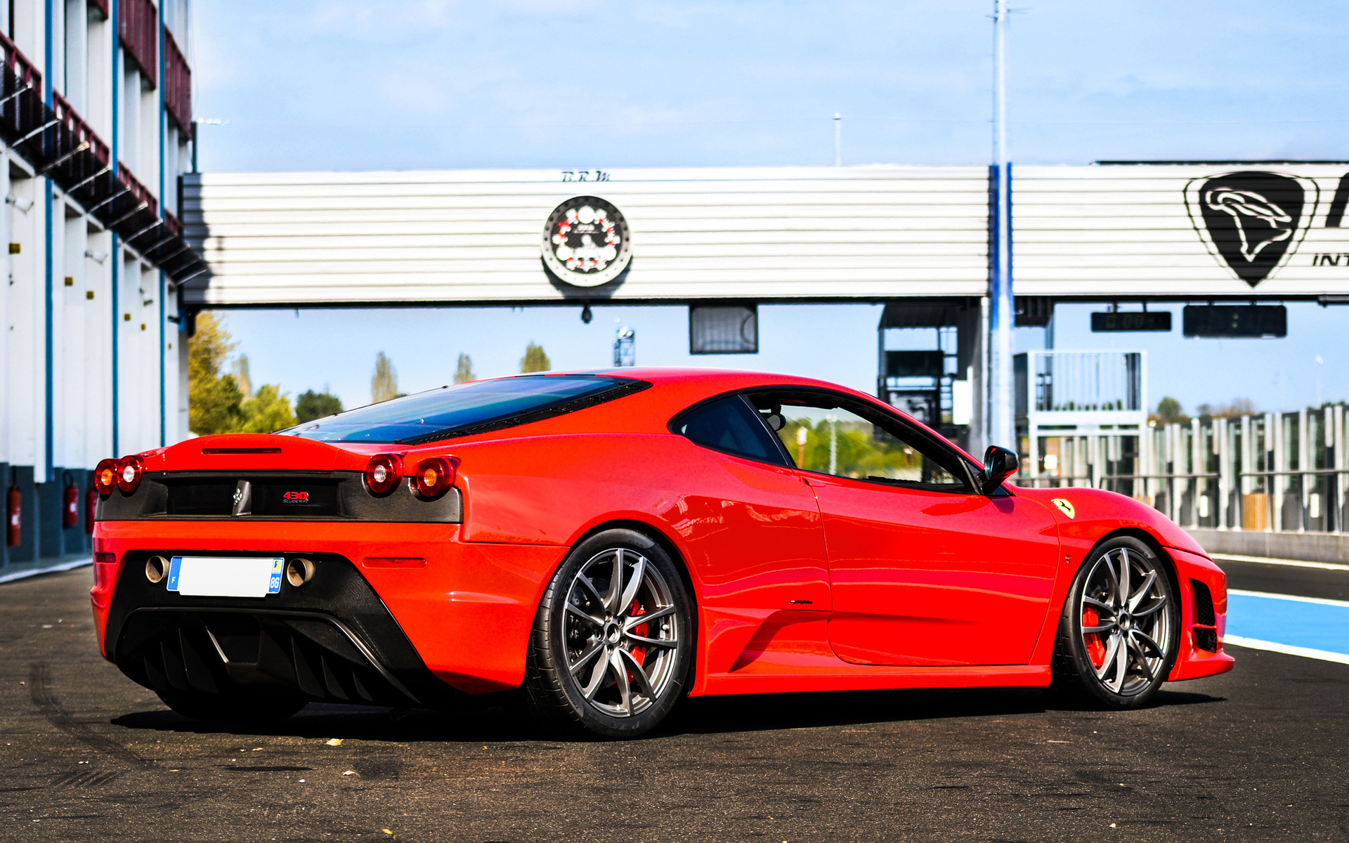 Description: A red sports car parked in a parking lot next to a building with a sign on it that says ferrari.