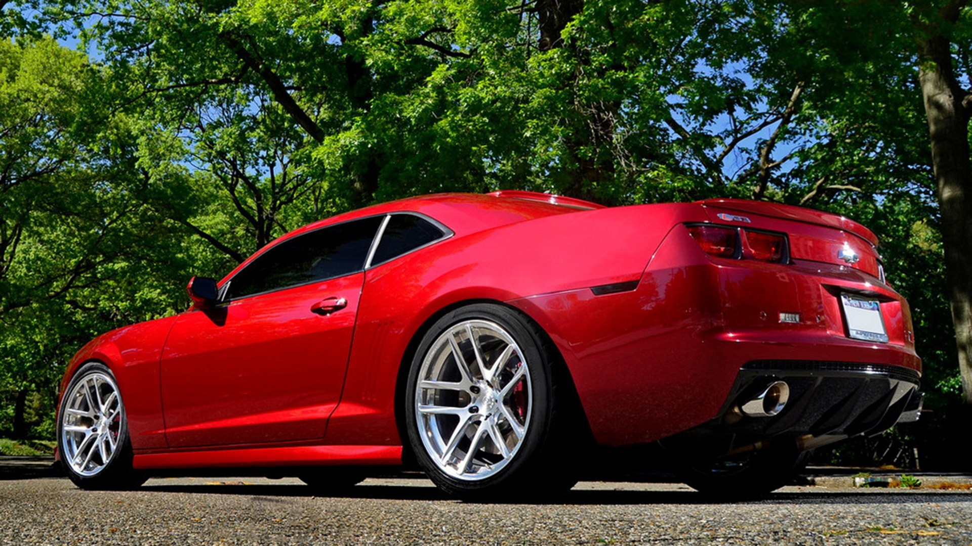 Description: A red sports car parked in a parking lot next to trees and bushes.