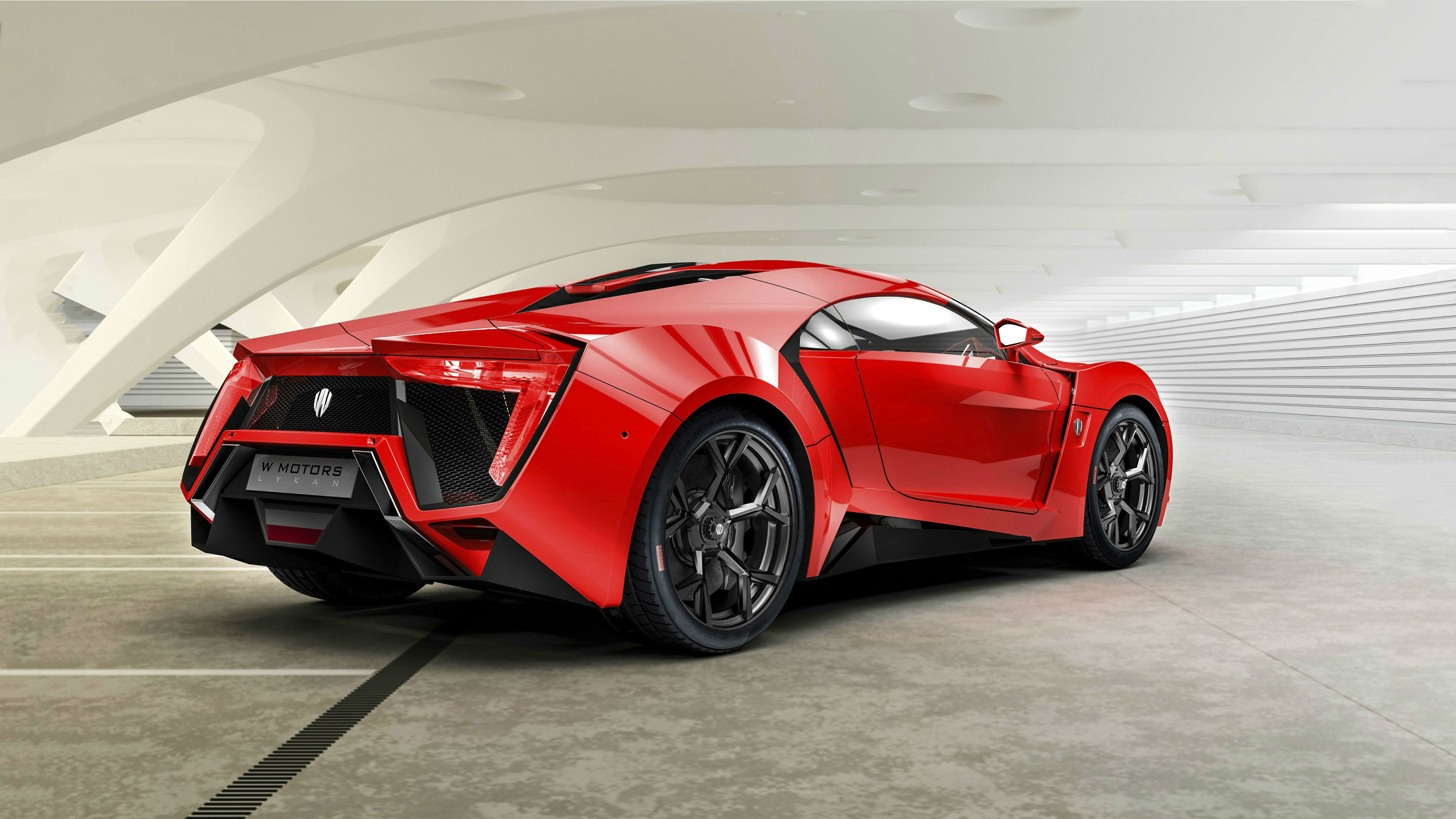Description: A red sports car parked in a parking lot next to a building with a white wall behind it and a white ceiling.