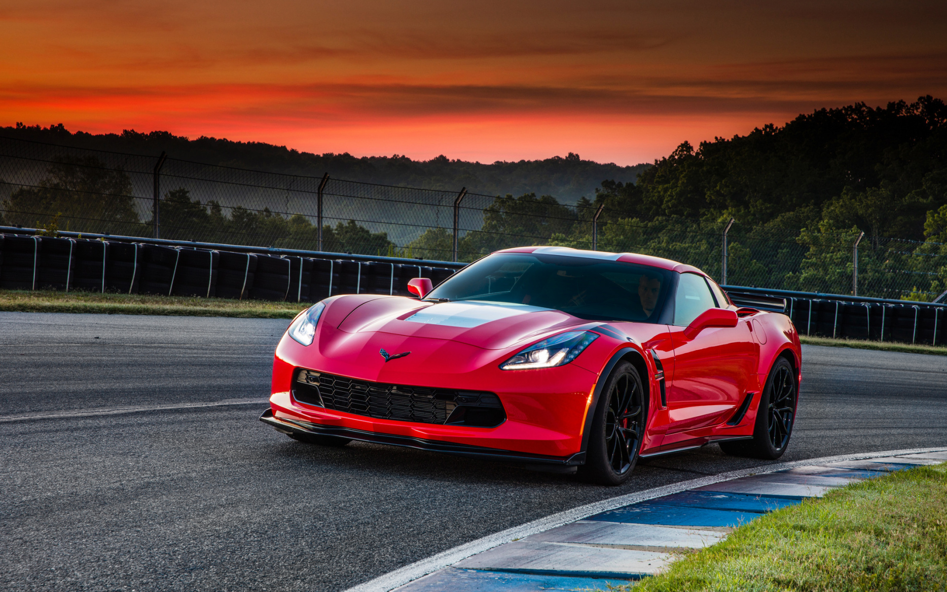 Description: A red sports car driving on a race track at sunset or dawn with a red sky in the background.