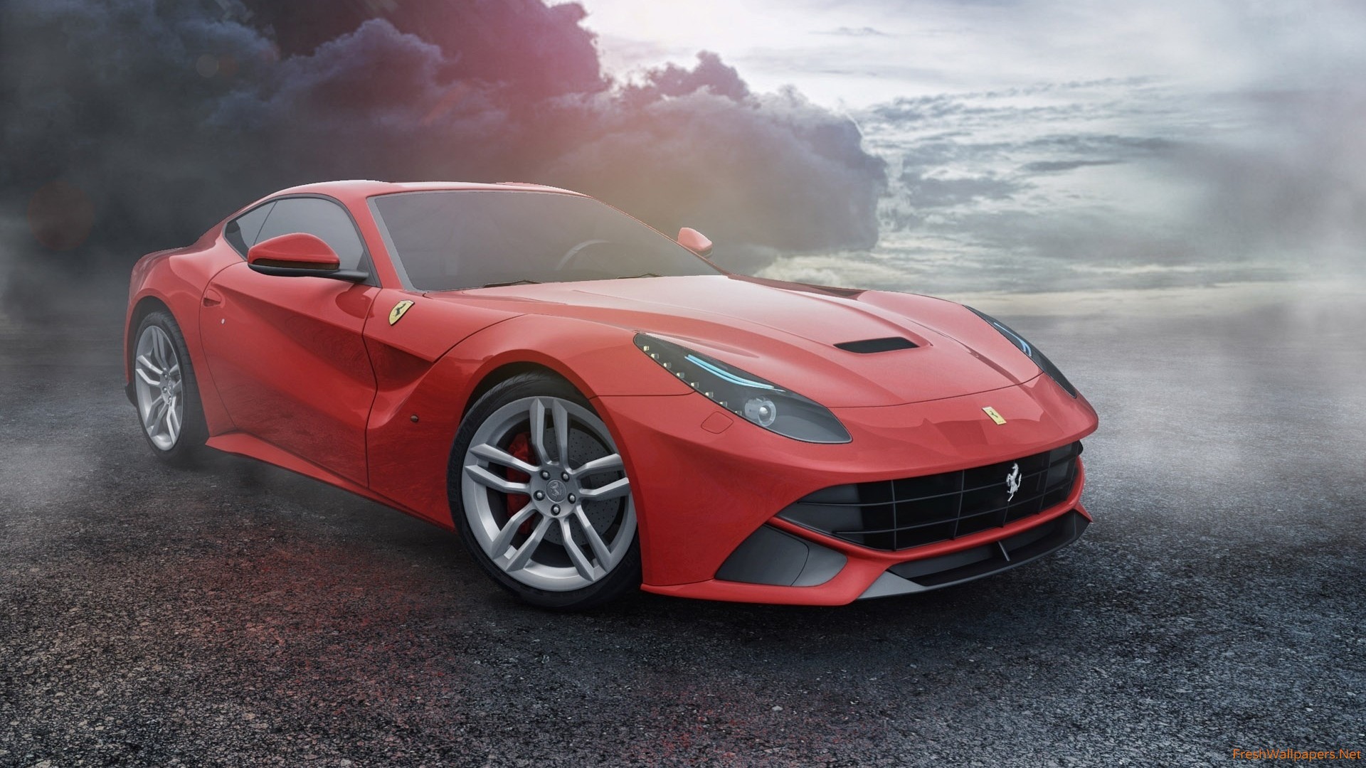 Description: A red sports car is parked in a lot with smoke coming out of the back of it's hood.
