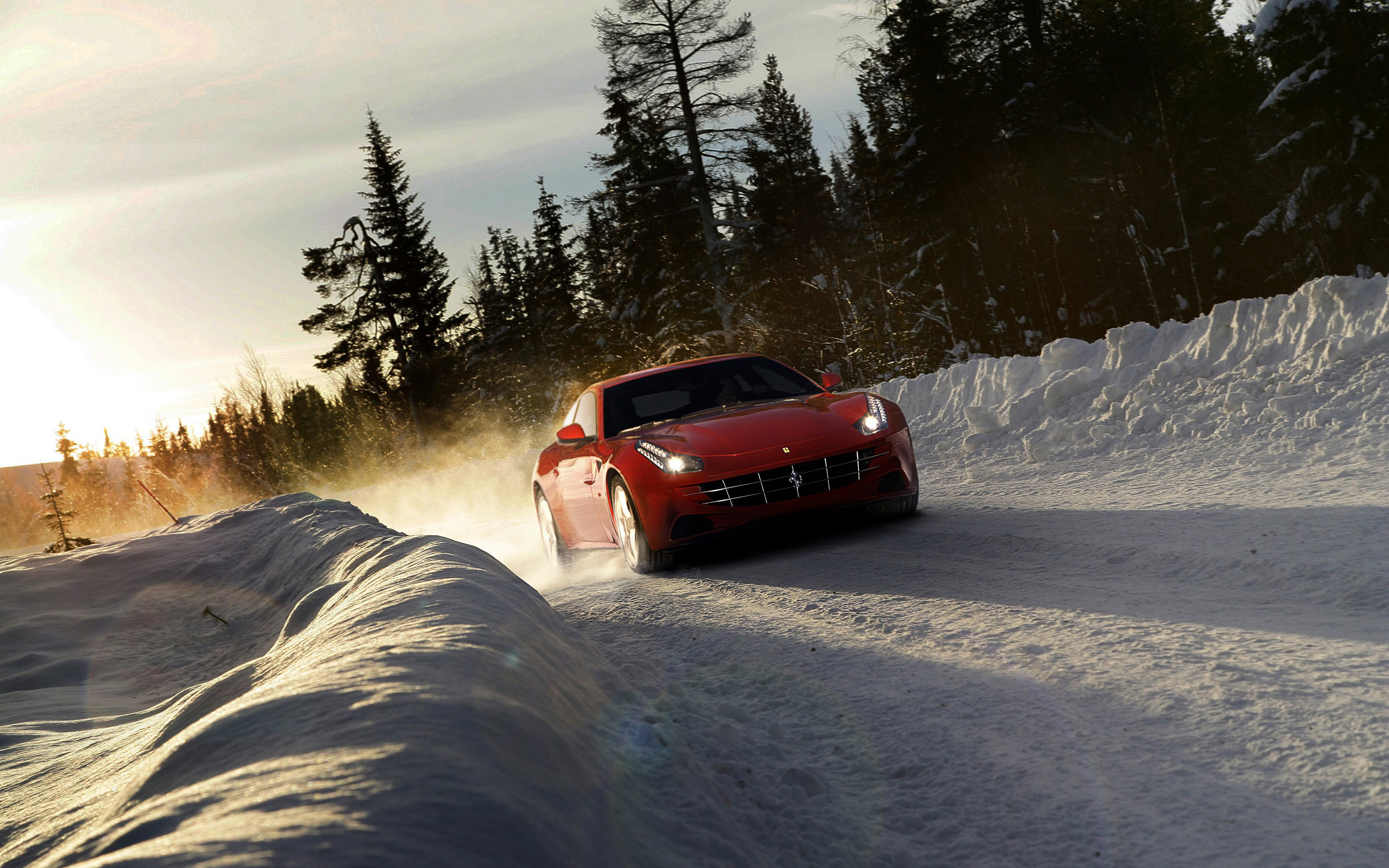 Description: A red sports car driving down a snow covered road in the sun light.