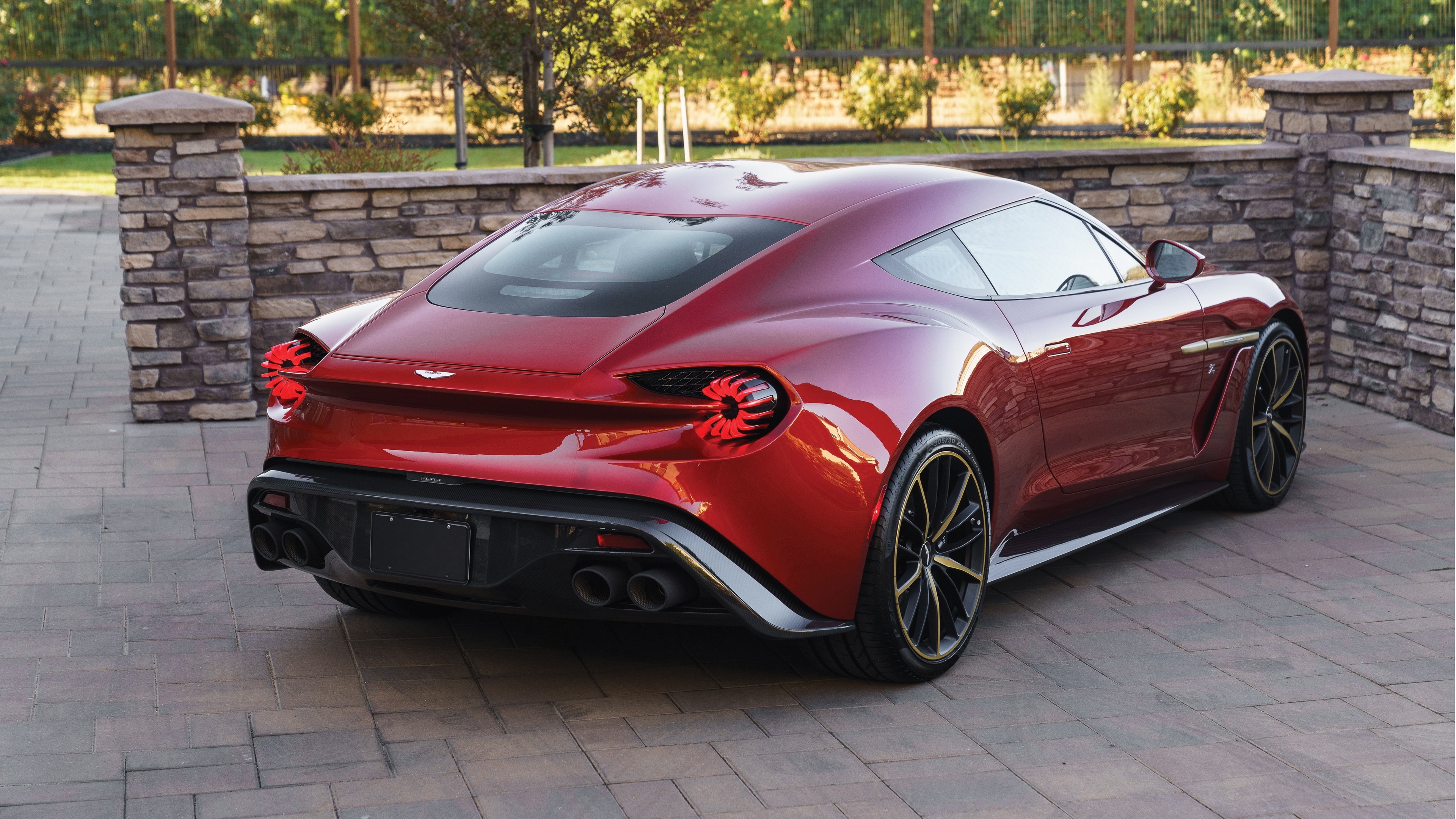 Description: A red sports car parked in front of a stone wall and a brick wall behind it is a brick wall and a stone wall.