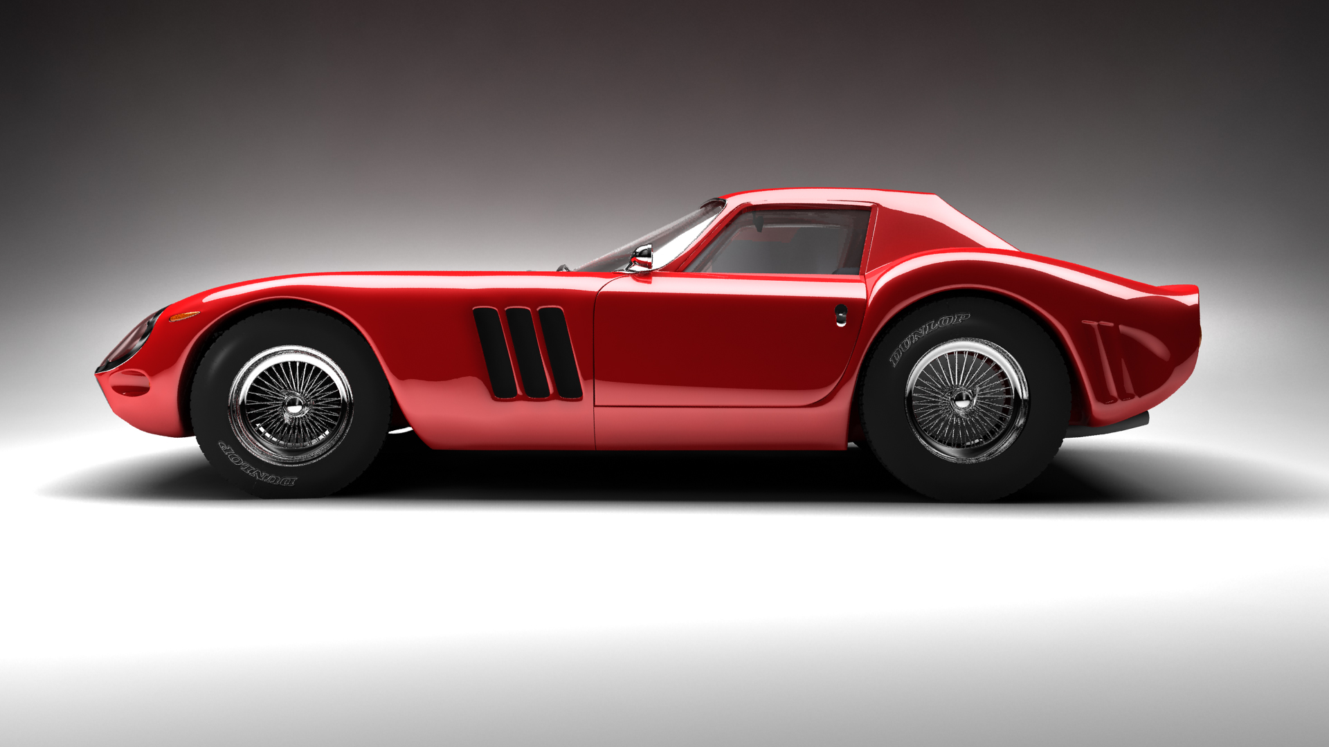 Description: A red sports car is shown in a studio photo with a gray background and a white background behind it.