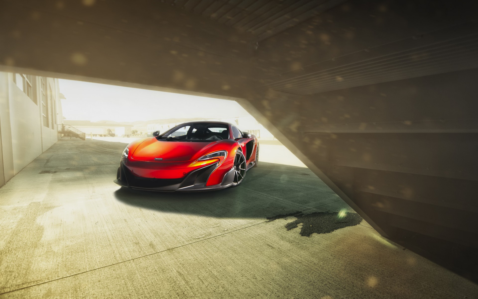 Description: A red sports car parked in a tunnel with a sky background and a sun light coming through the tunnel.