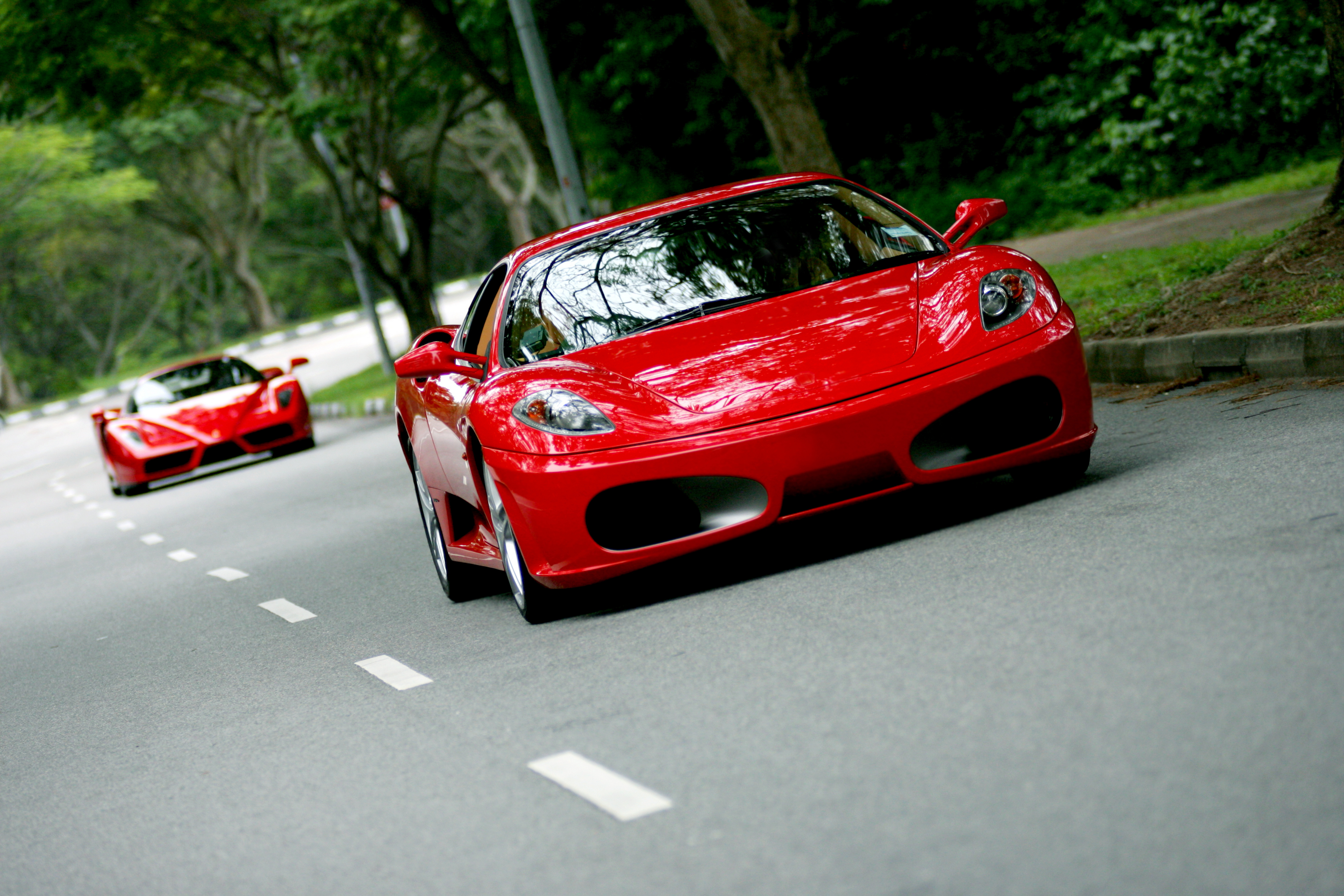 Description: Two red sports cars driving down a street next to trees and bushes on a sunny day with no one in the photo.
