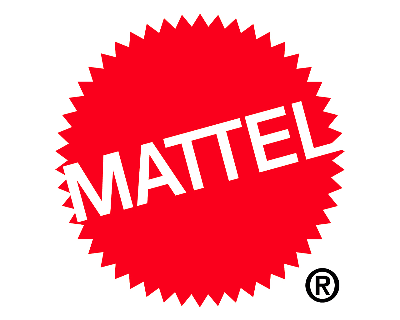 Description: A red sticker with the word mattel in white letters on it and a black circle with the word mattel in white.