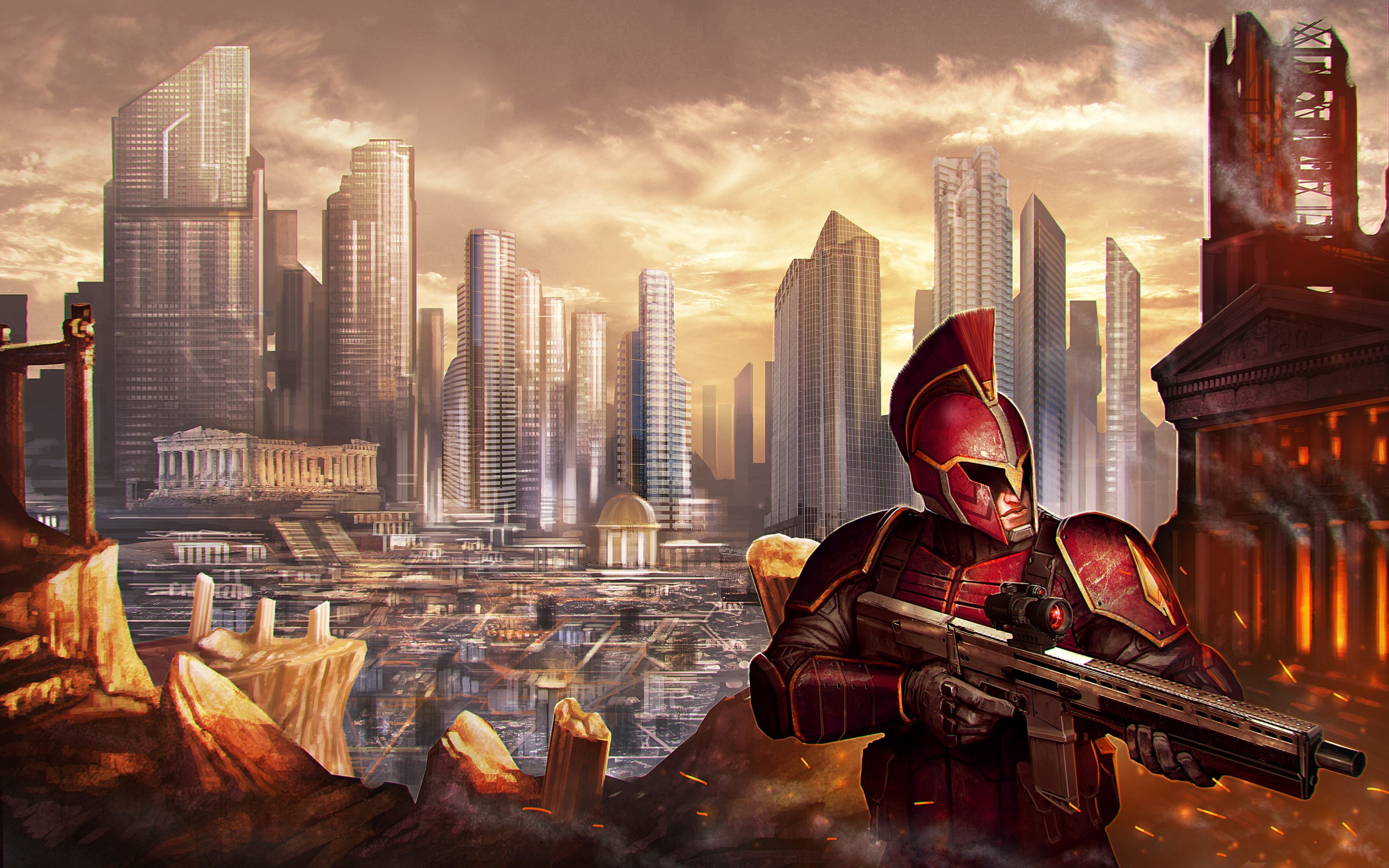 Description: A man in a red suit holding a gun in front of a cityscape with skyscrapers in the background.