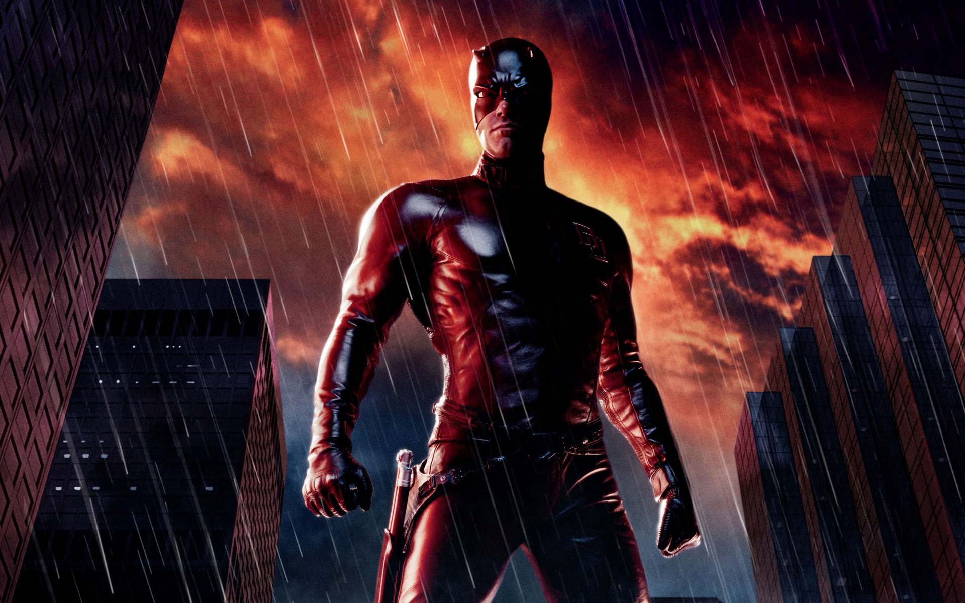 Description: A man in a red suit standing in the rain in a city with skyscrapers and clouds in the background.