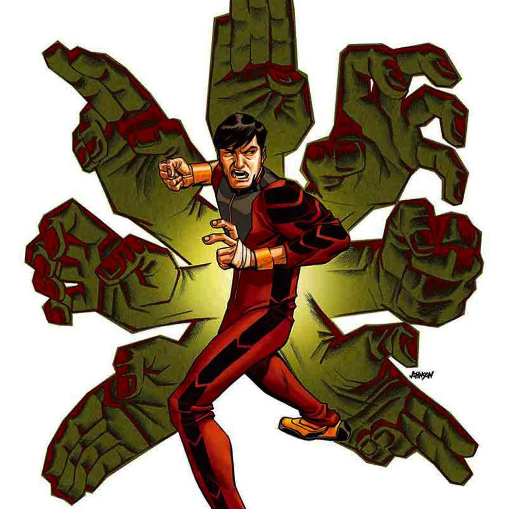 Description: A man in a red suit is running with his hands in the air and a light shining behind him.