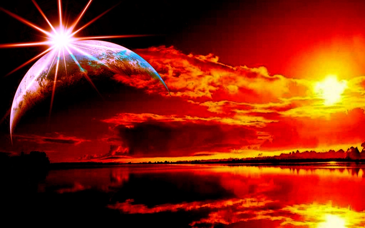 Description: A red sunset with a planet in the background and a reflection of the sun in the water below it.
