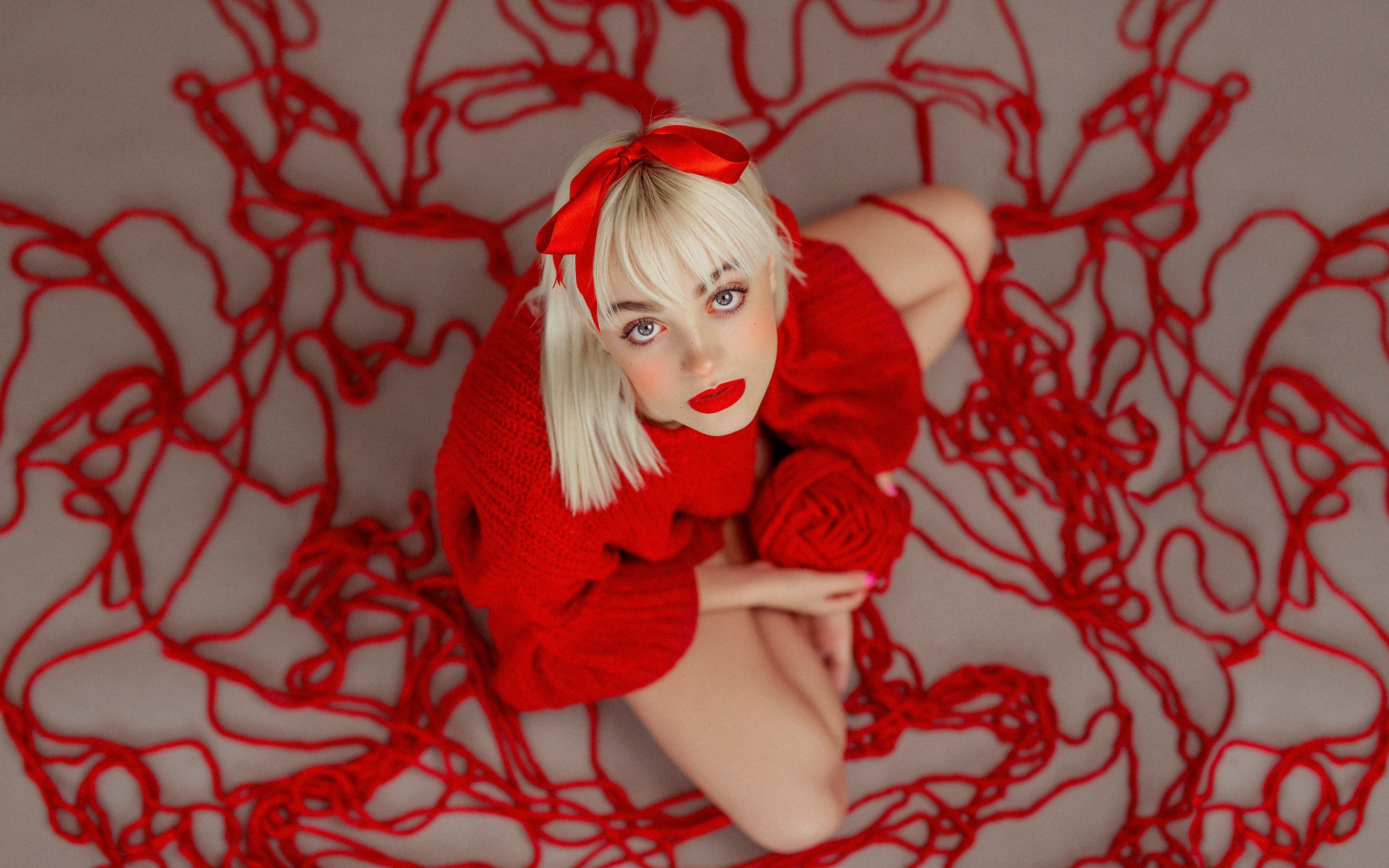 Description: A woman in a red sweater and red shoes laying on a red string with a red rose on it.
