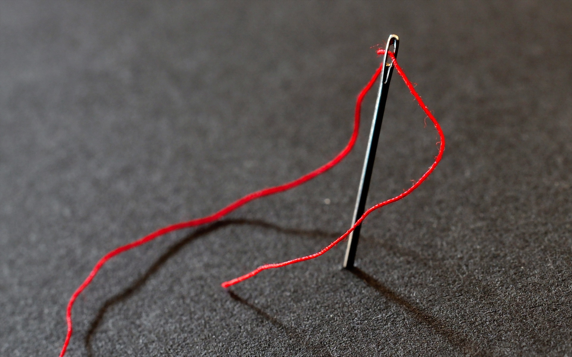 Description: A red thread is being used to make a knitting project on a table top with a needle and a needle tip.