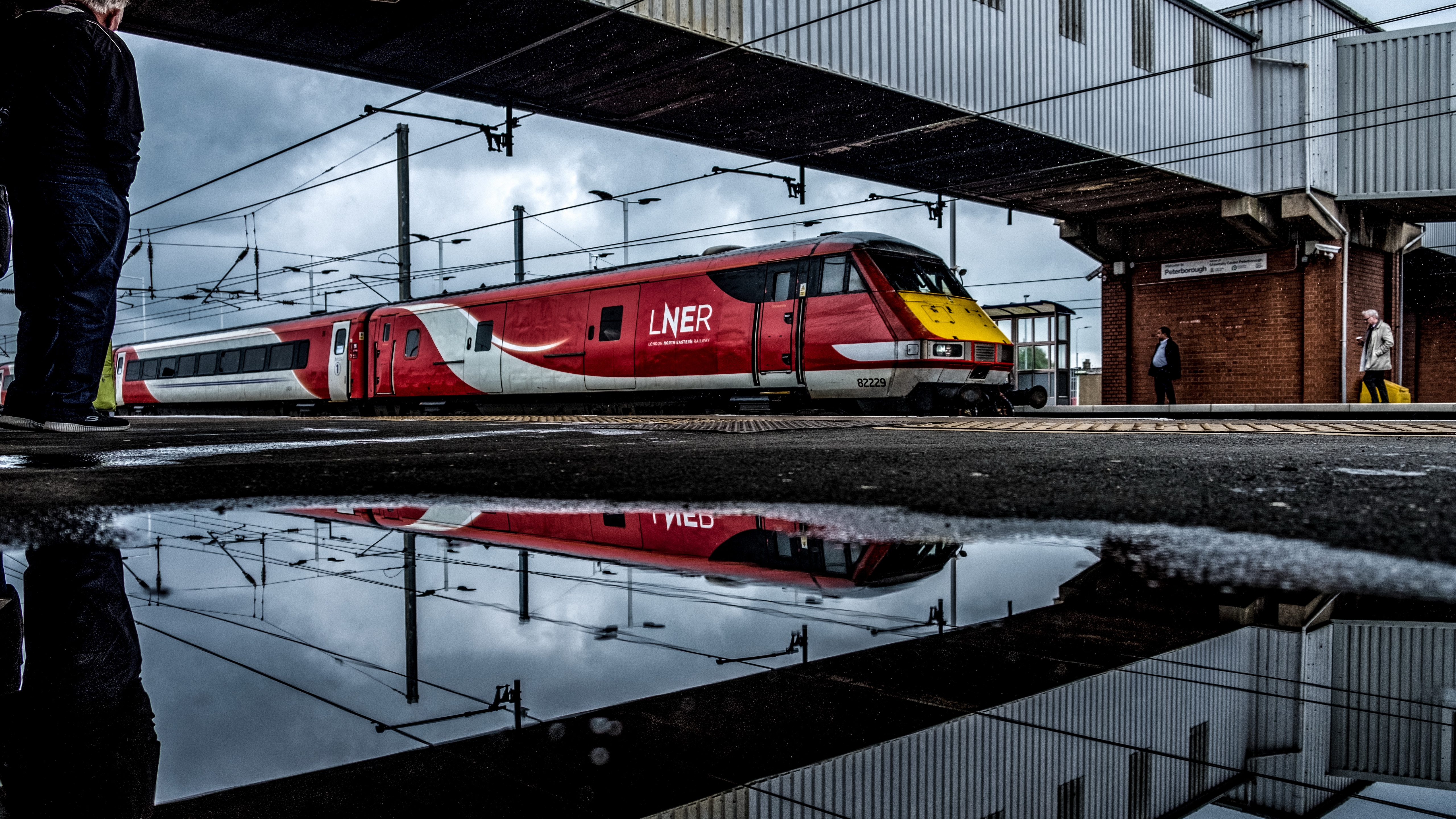 Description: A red train is passing under a bridge and a person is standing on the platform next to it and a puddle of water is in the ground.