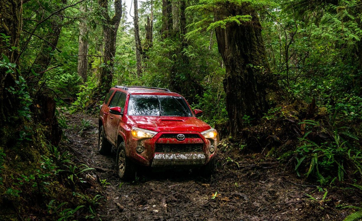 Description: A red truck is driving through a forest trail in the rain and mud.